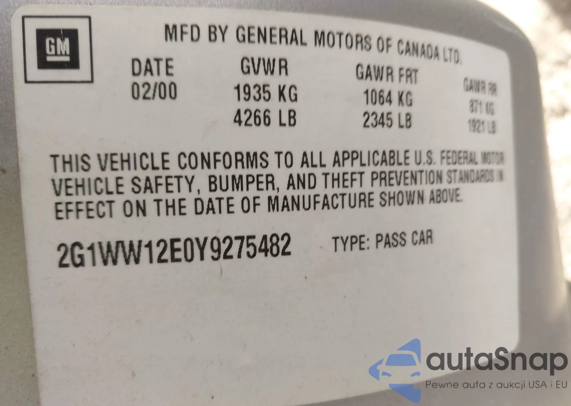 • VIN 2G1WW12E0Y9275482