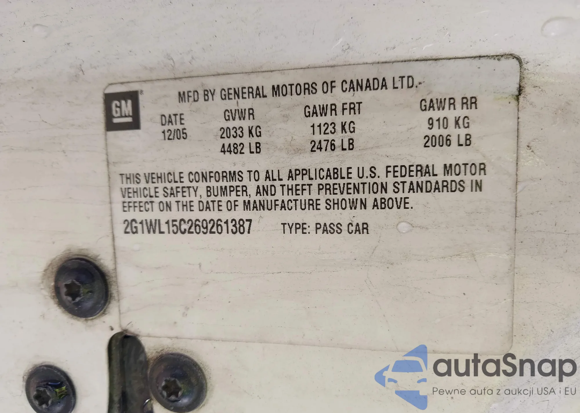 • VIN 2G1WL15C269261387