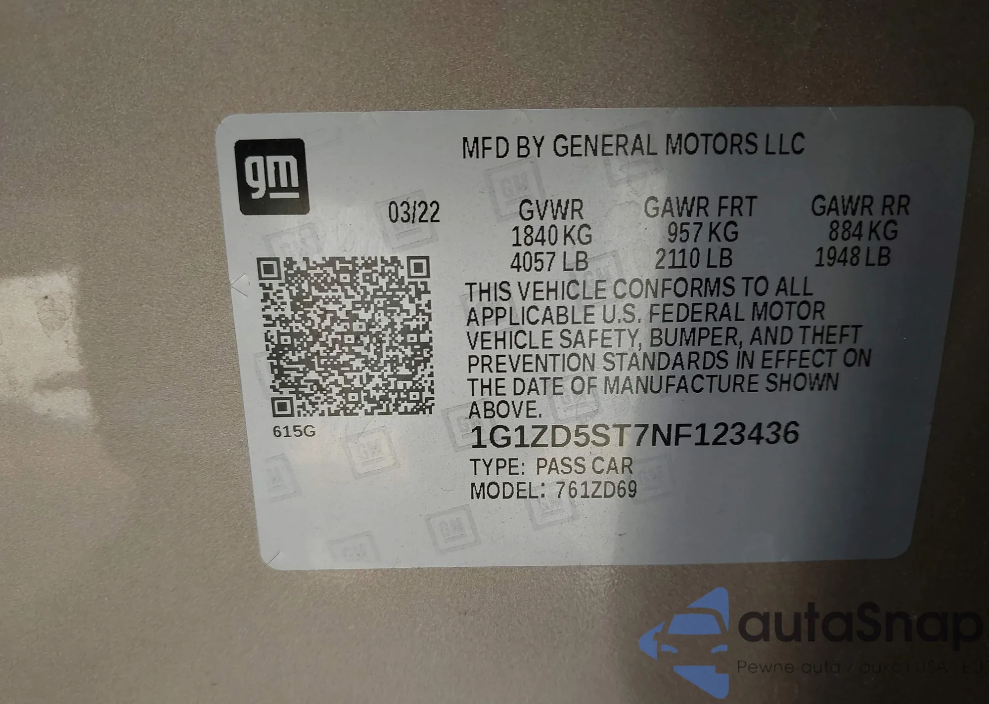 LOT: 44205213 VIN: 1G1ZD5ST7NF123436