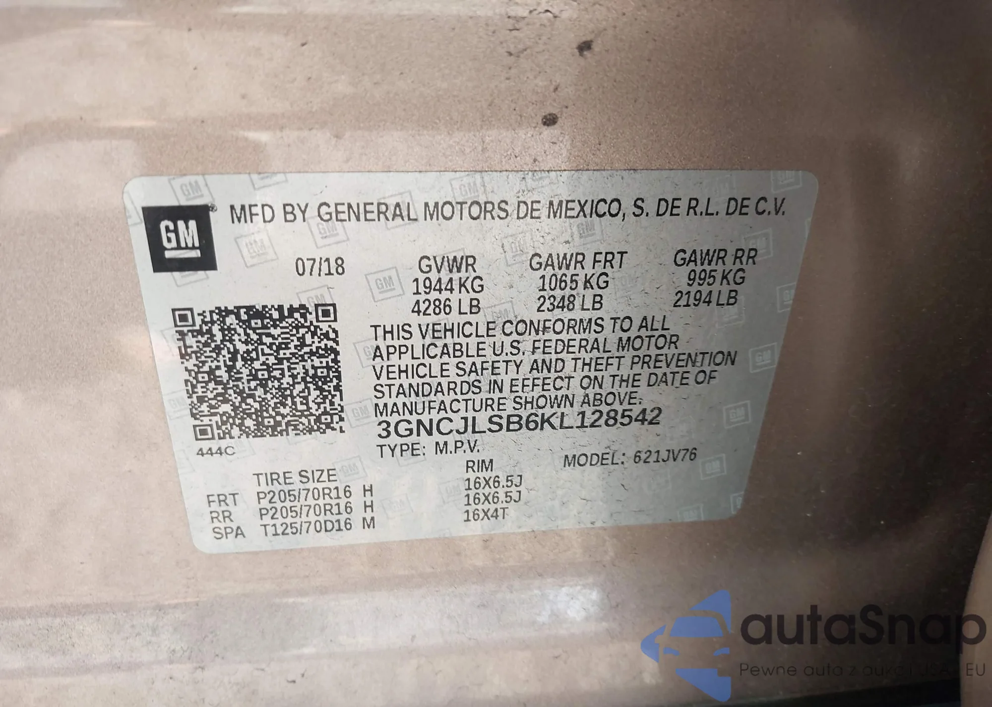 • VIN 3GNCJLSB6KL128542