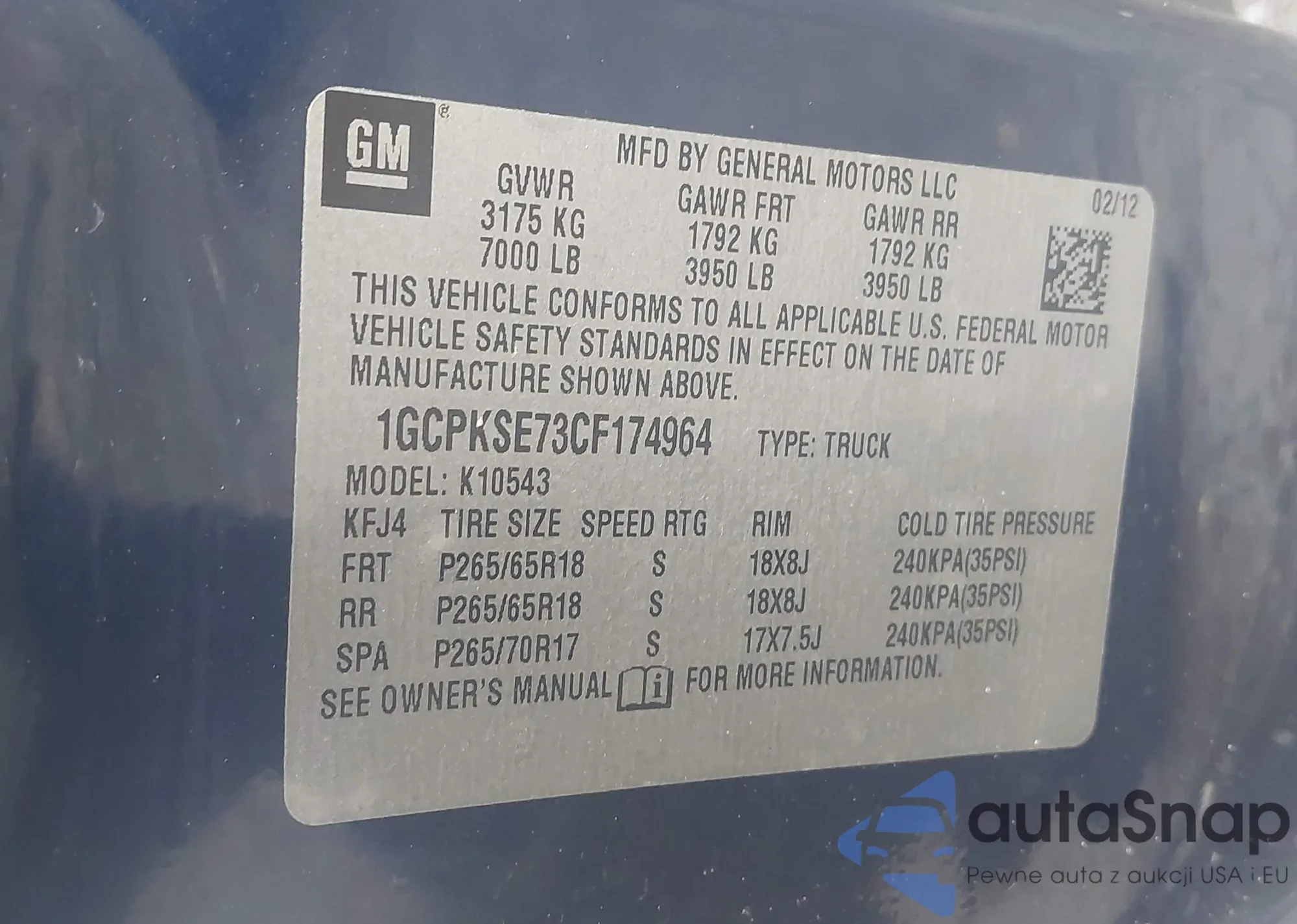 • VIN 1GCPKSE73CF174964