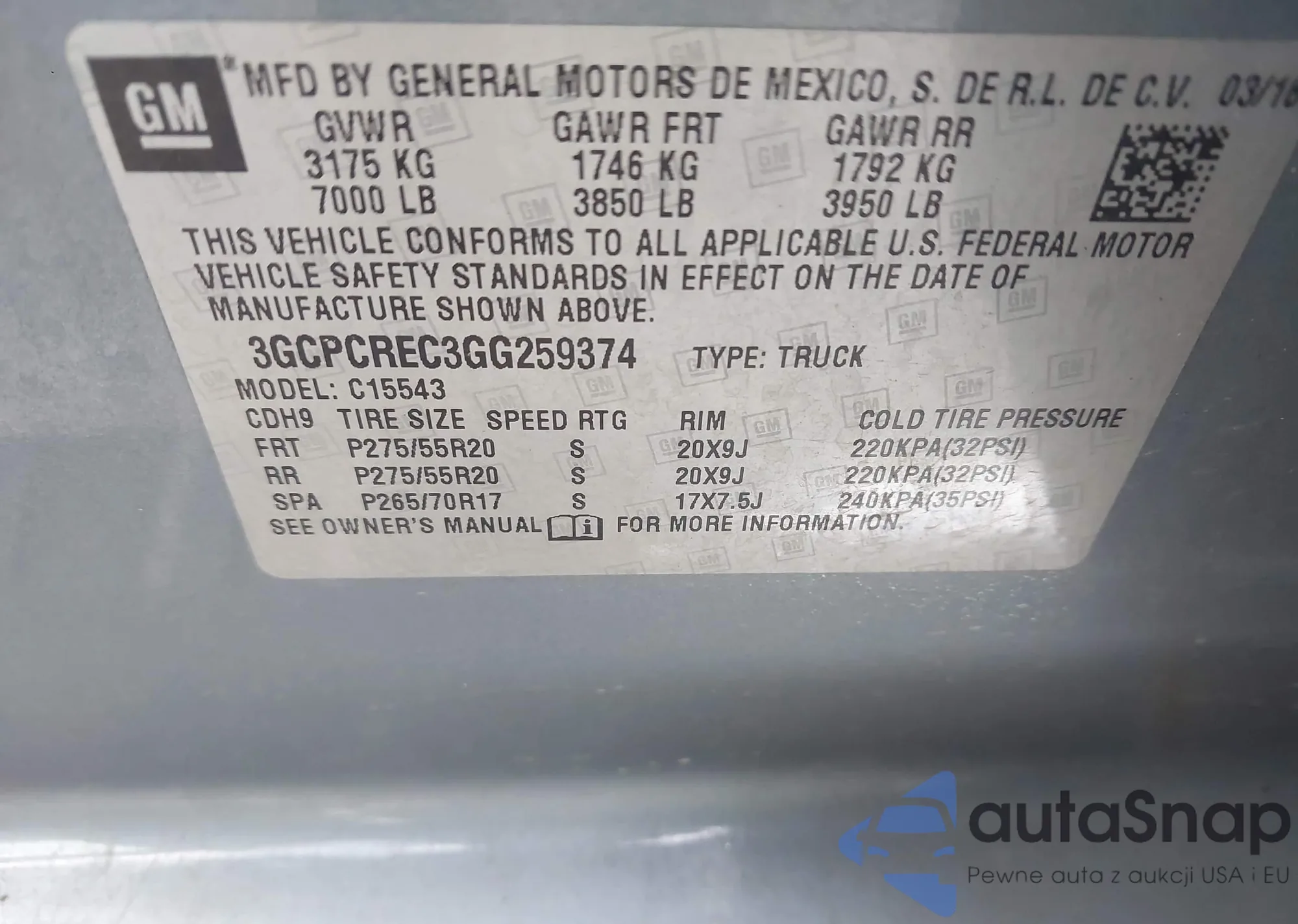 • VIN 3GCPCREC3GG259374