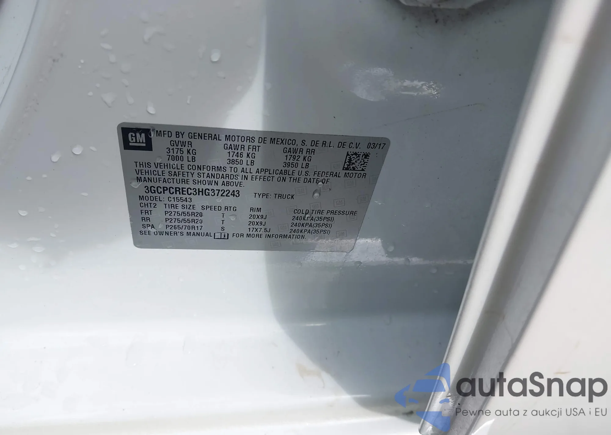 • VIN 3GCPCREC3HG372243