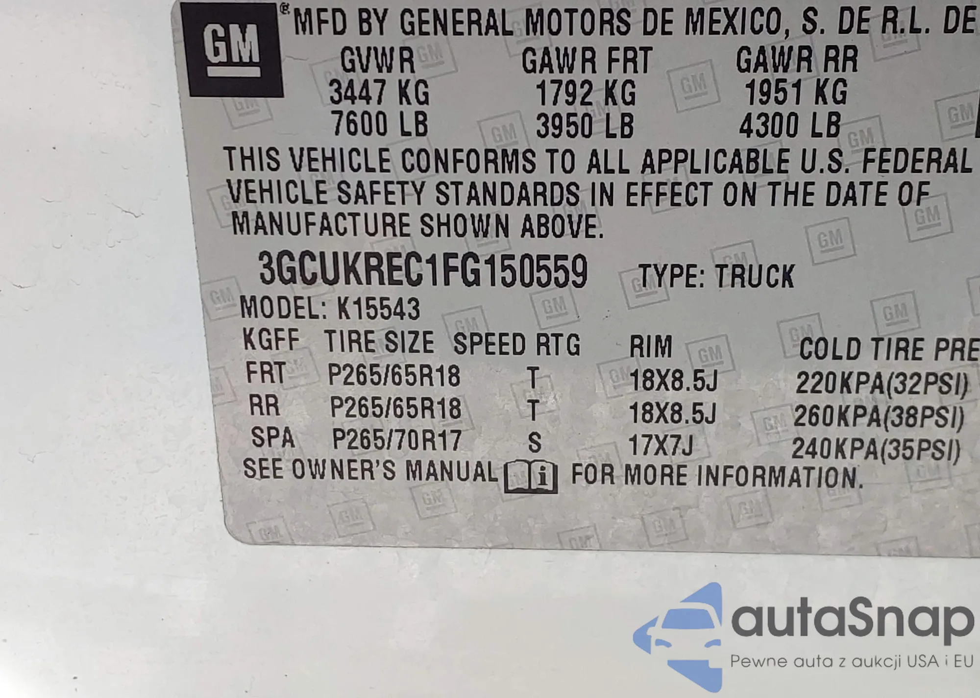 LOT: 43458533 VIN: 3GCUKREC1FG150559