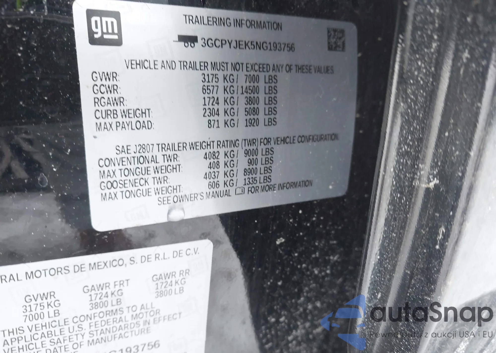 • VIN 3GCPYJEK5NG193756