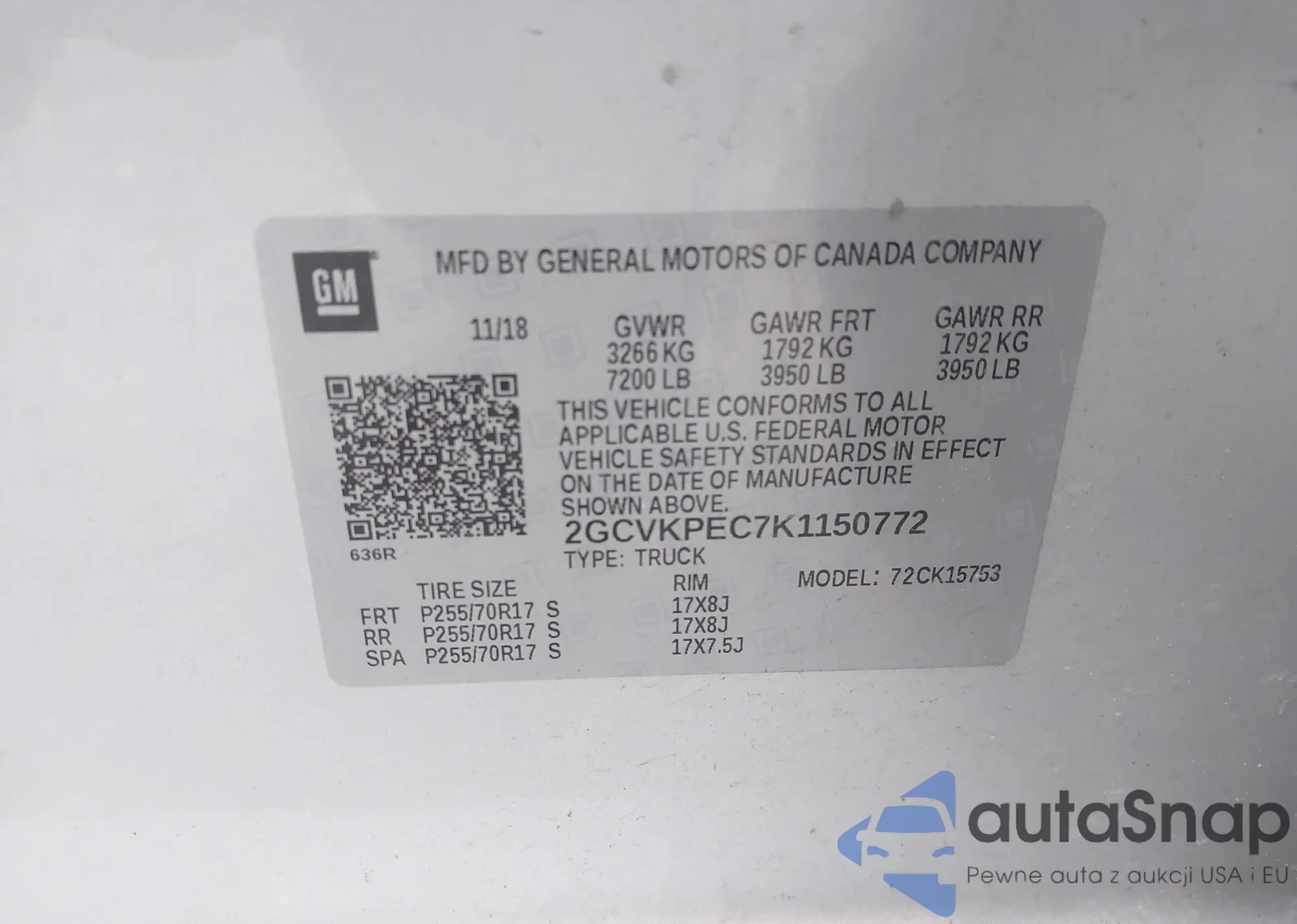 • VIN 2GCVKPEC7K1150772