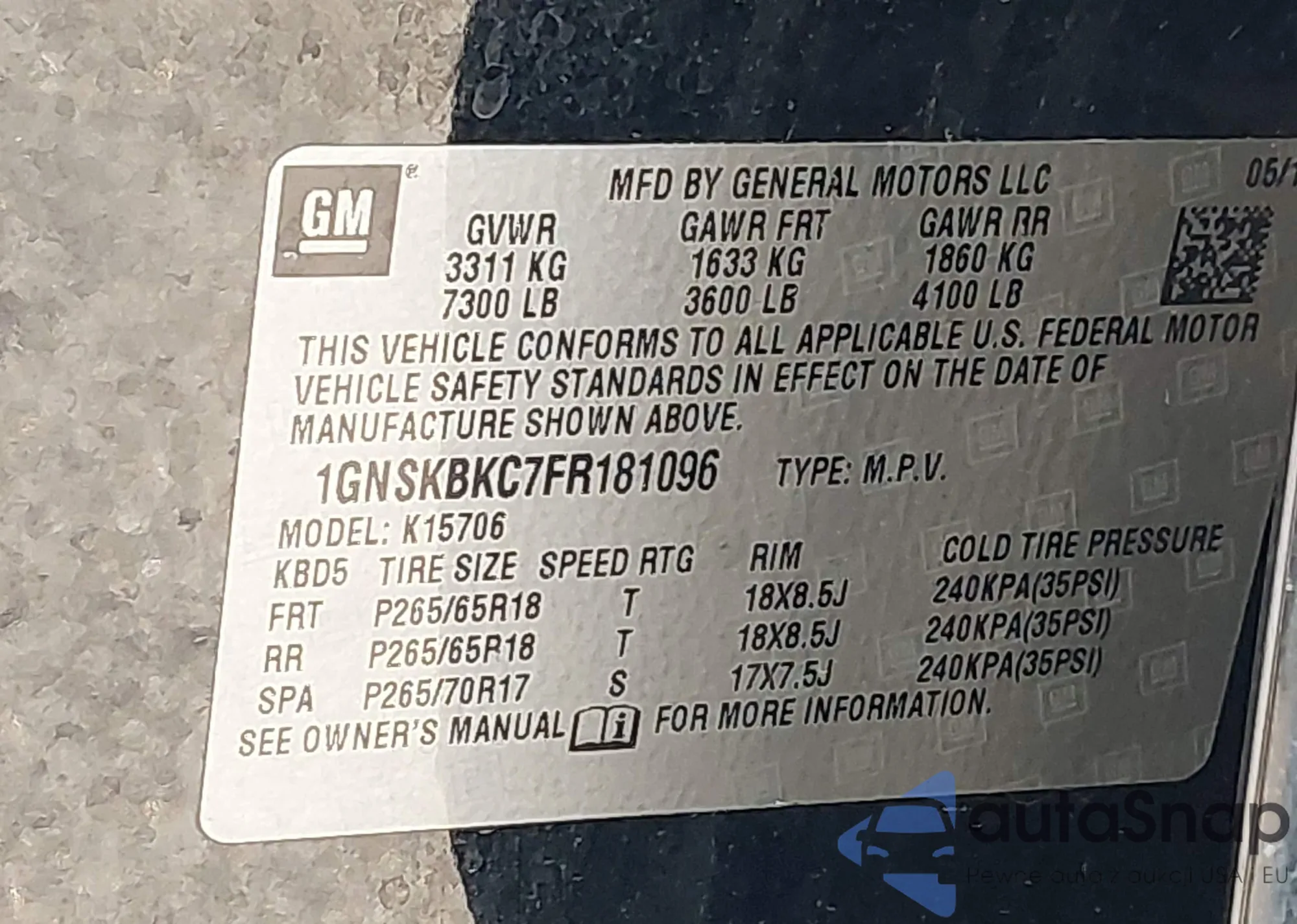 • VIN 1GNSKBKC7FR181096
