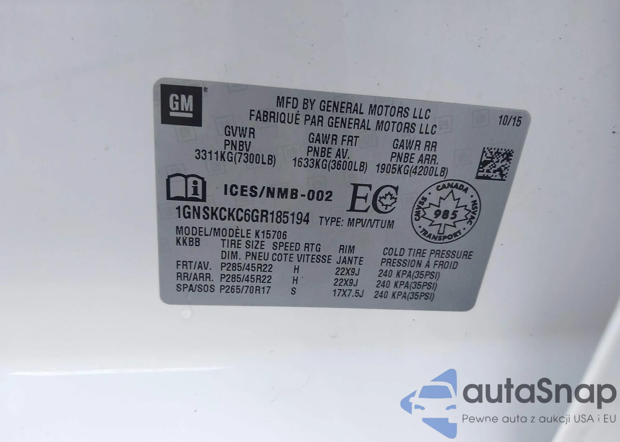 LOT: 44249846 VIN: 1GNSKBKC7FR181096