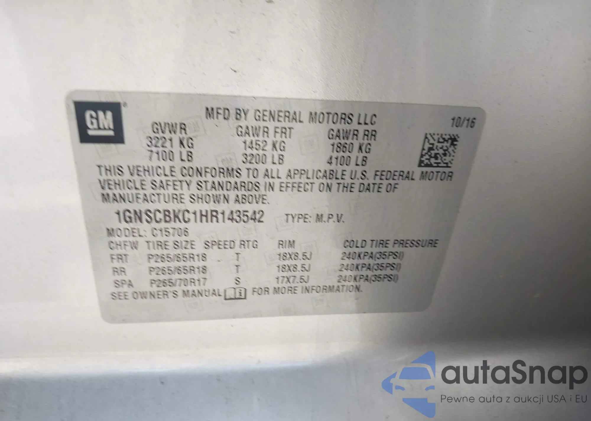 LOT: 44358578 VIN: 1GNSCBKC1HR143542