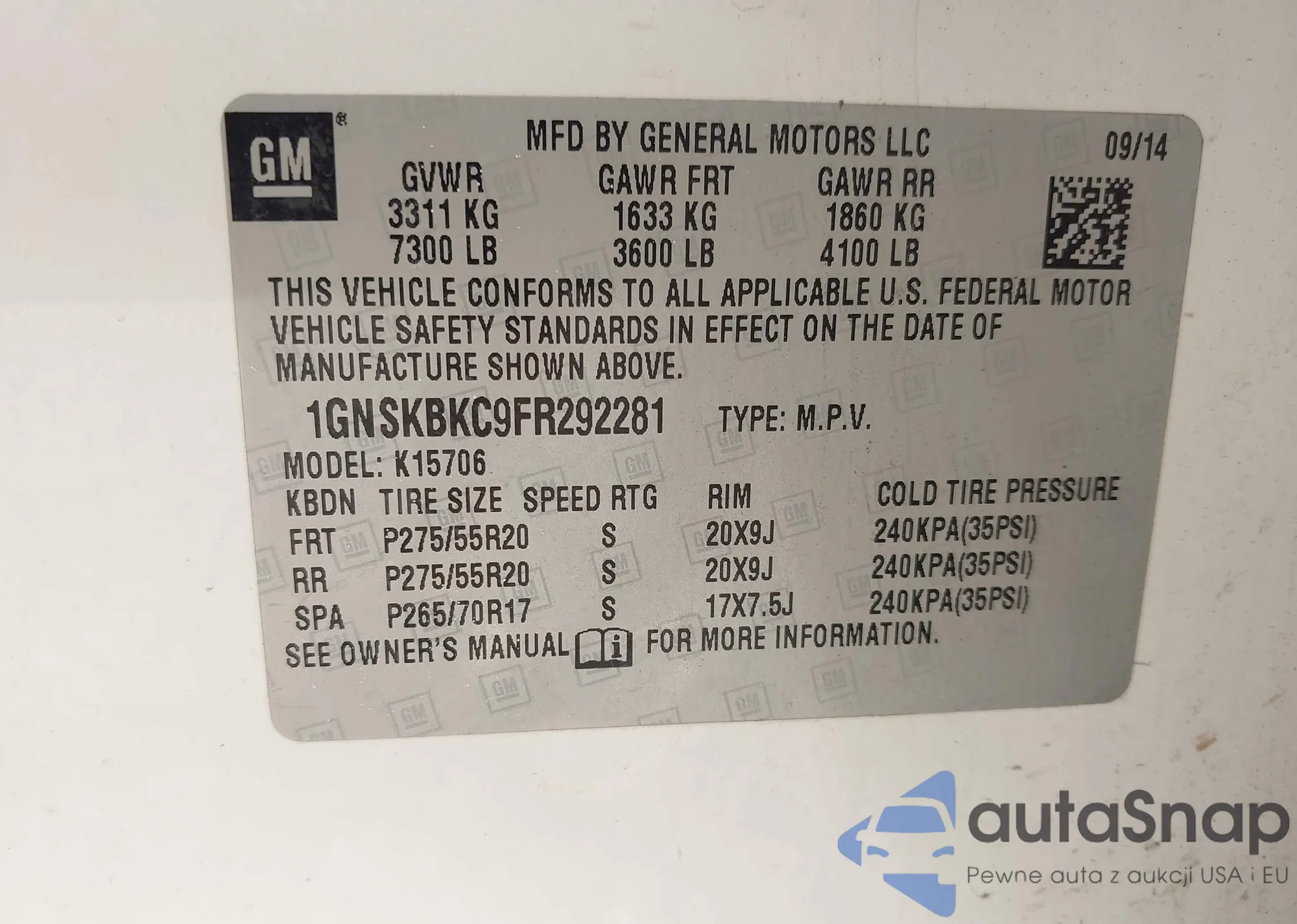 LOT: 44393276 VIN: 1GNSKBKC9FR292281