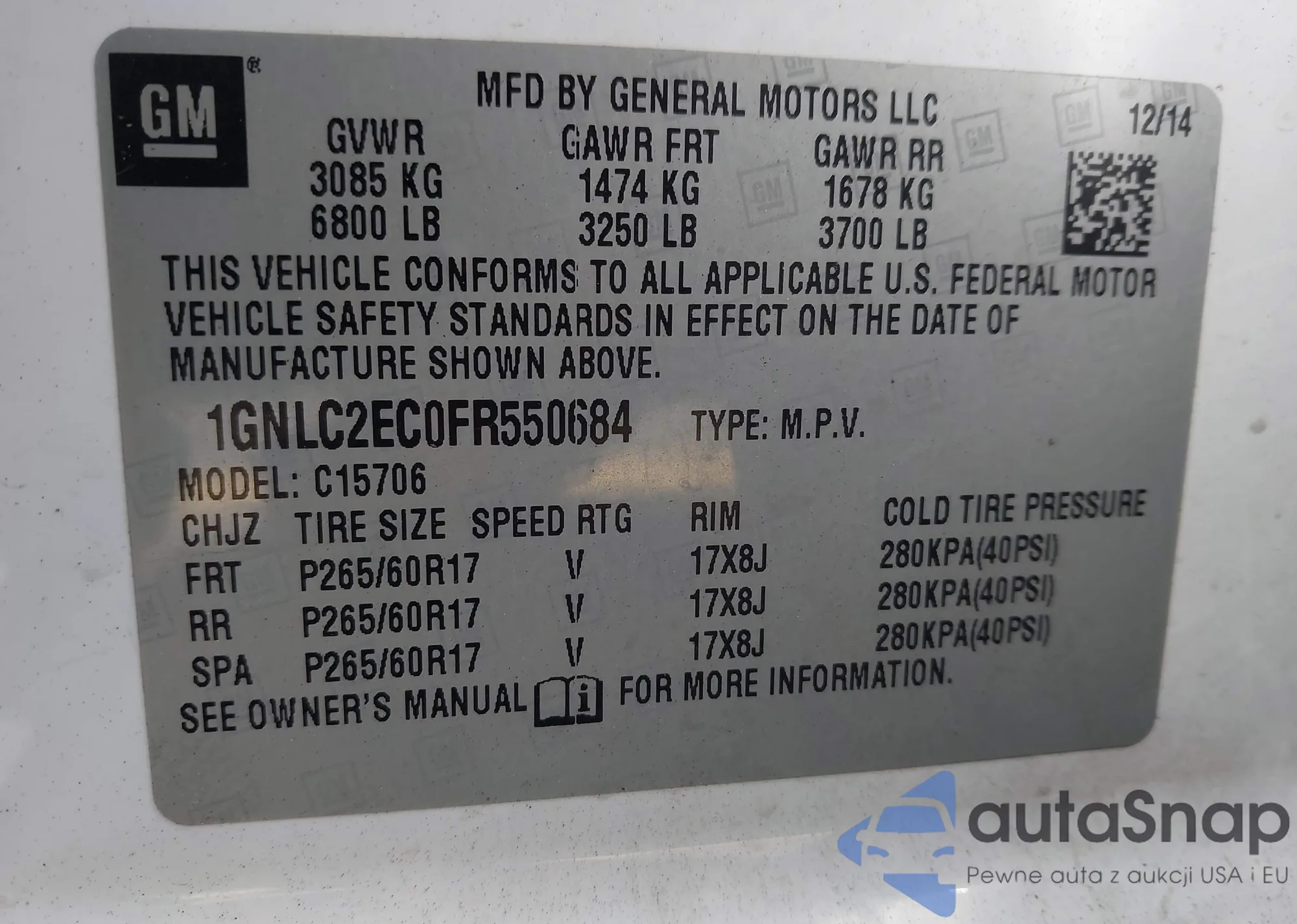 LOT: 43803727 VIN: 1GNSKBKCXFR707978