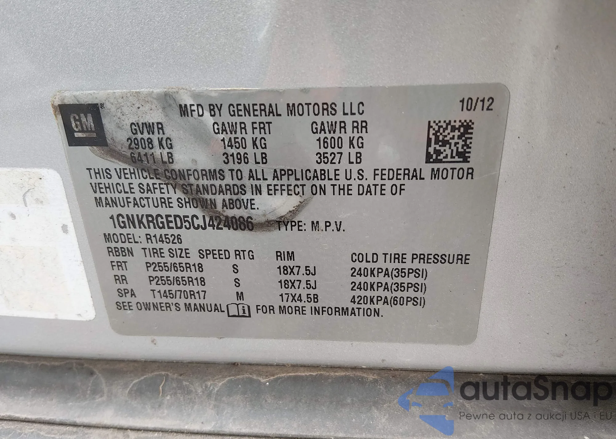 LOT: 44291284 VIN: 1GNKRGED5CJ424086