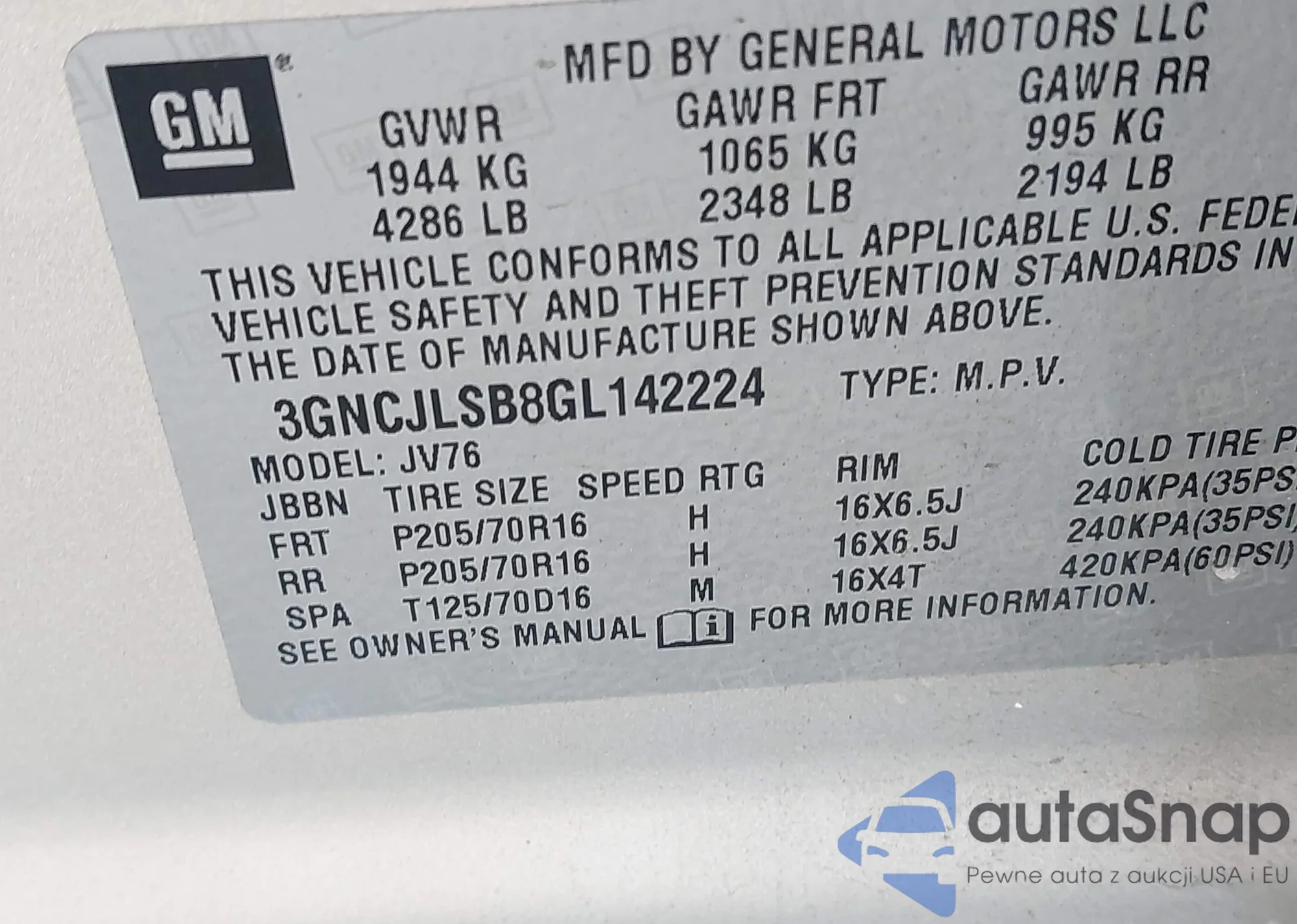 • VIN 3GNCJLSB8GL142224