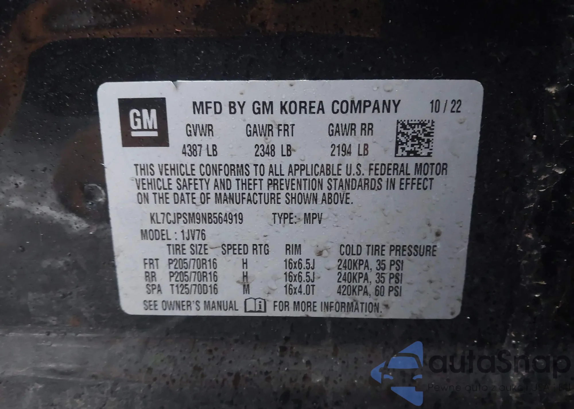 • VIN KL7CJPSM9NB564919