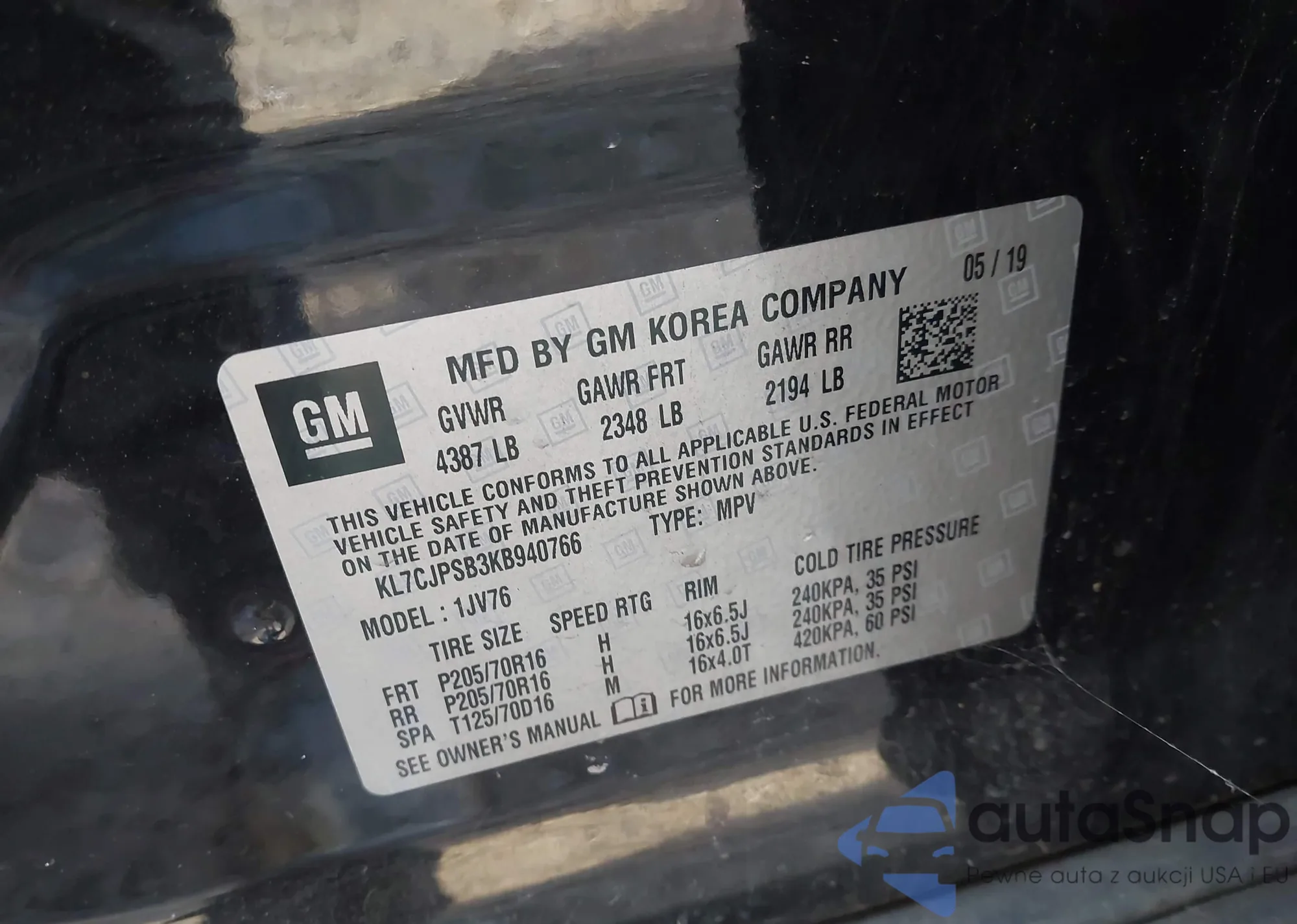 • VIN KL7CJPSB3KB940766