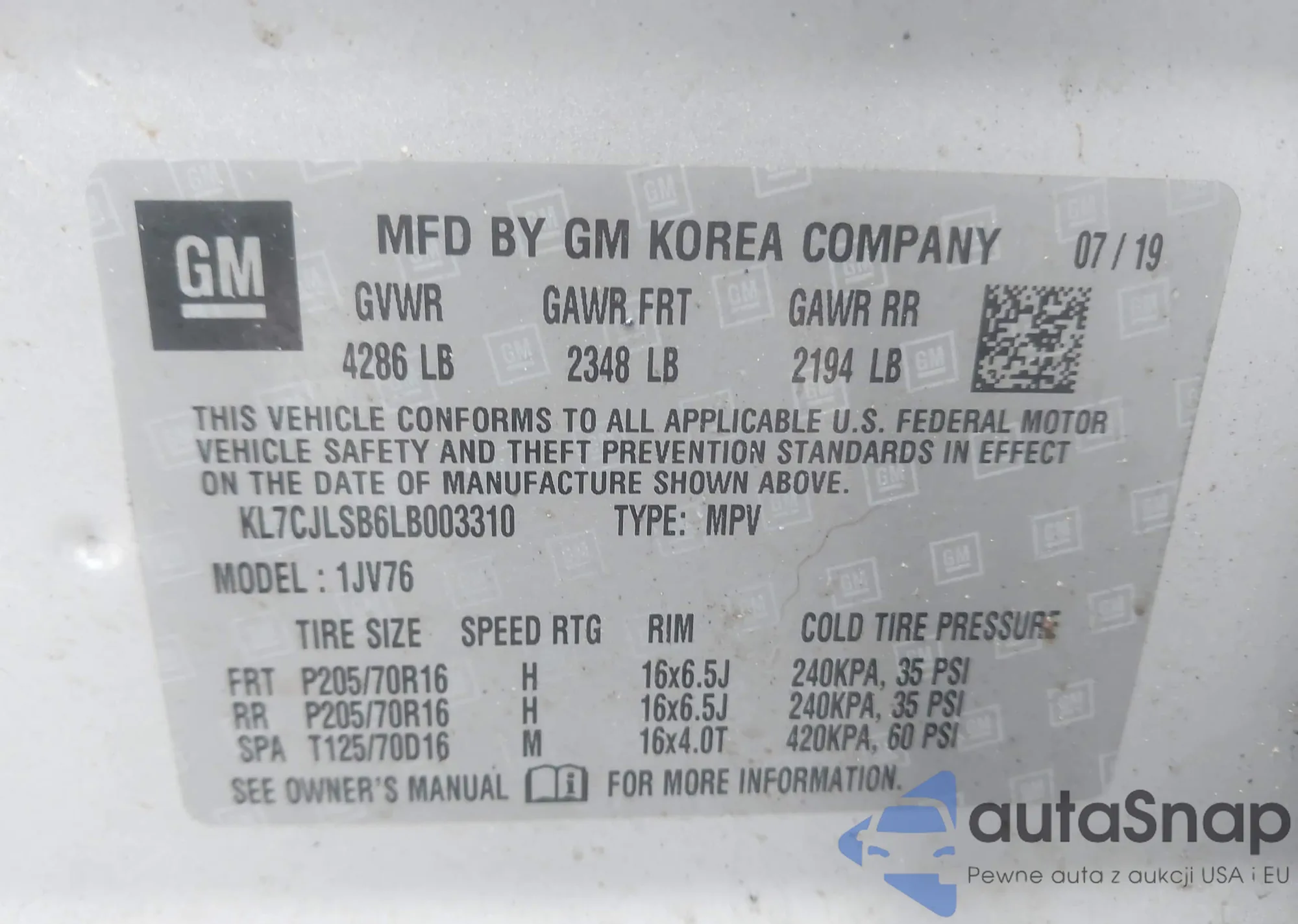 • VIN KL7CJLSB6LB003310