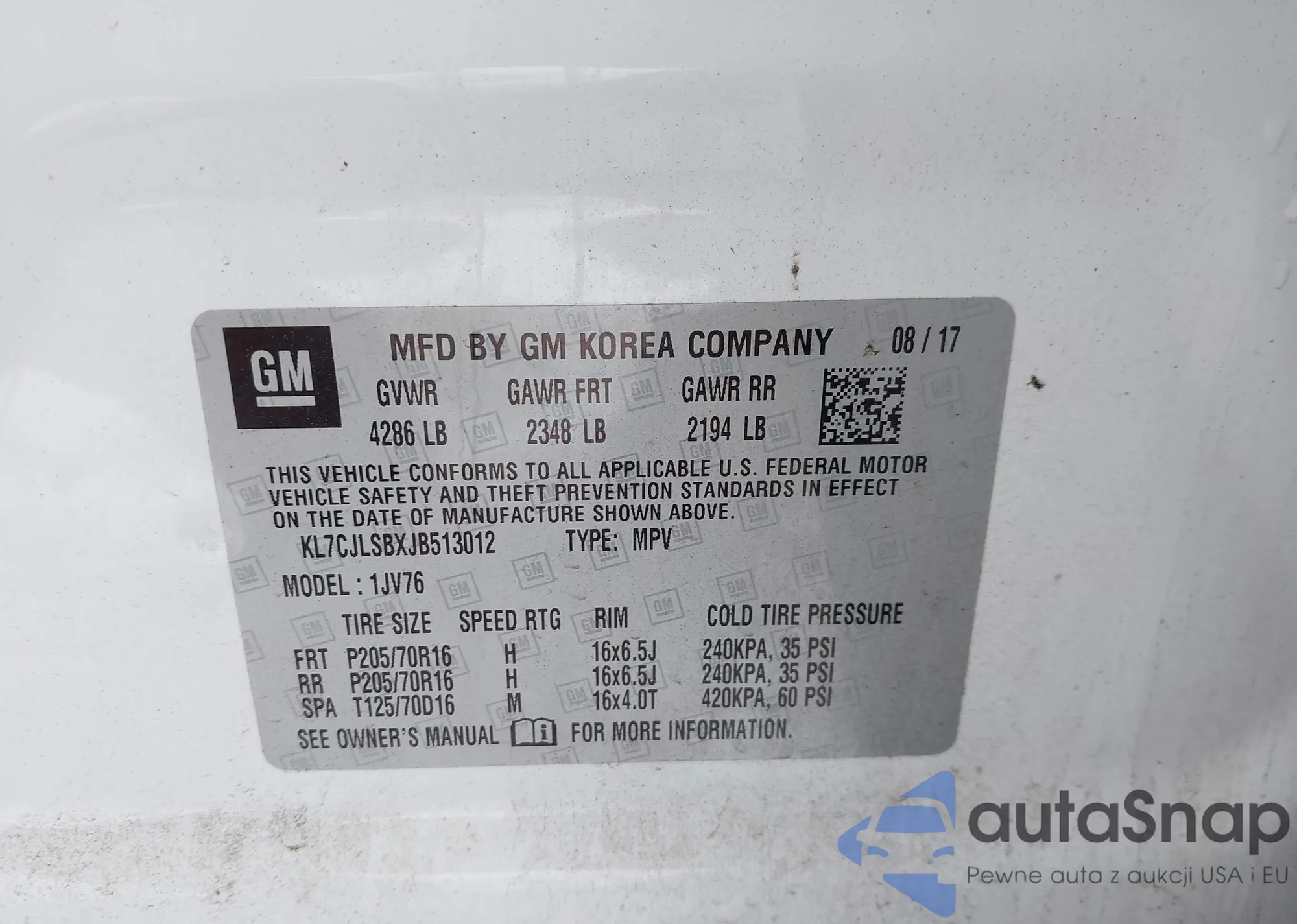 LOT: 43869253 VIN: KL7CJLSBXJB513012