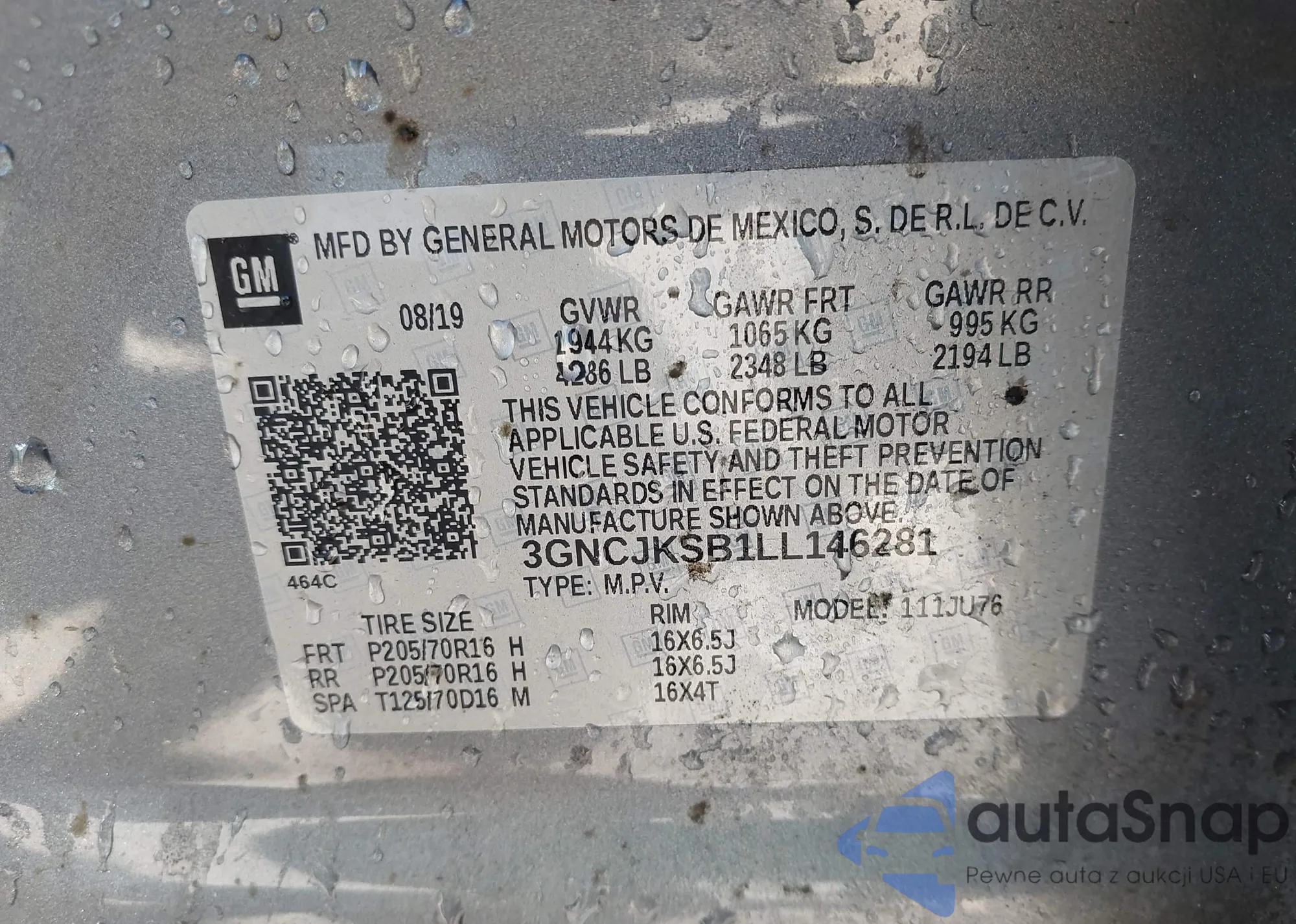 LOT: 44129602 VIN: KL7CJLSB2LB352898