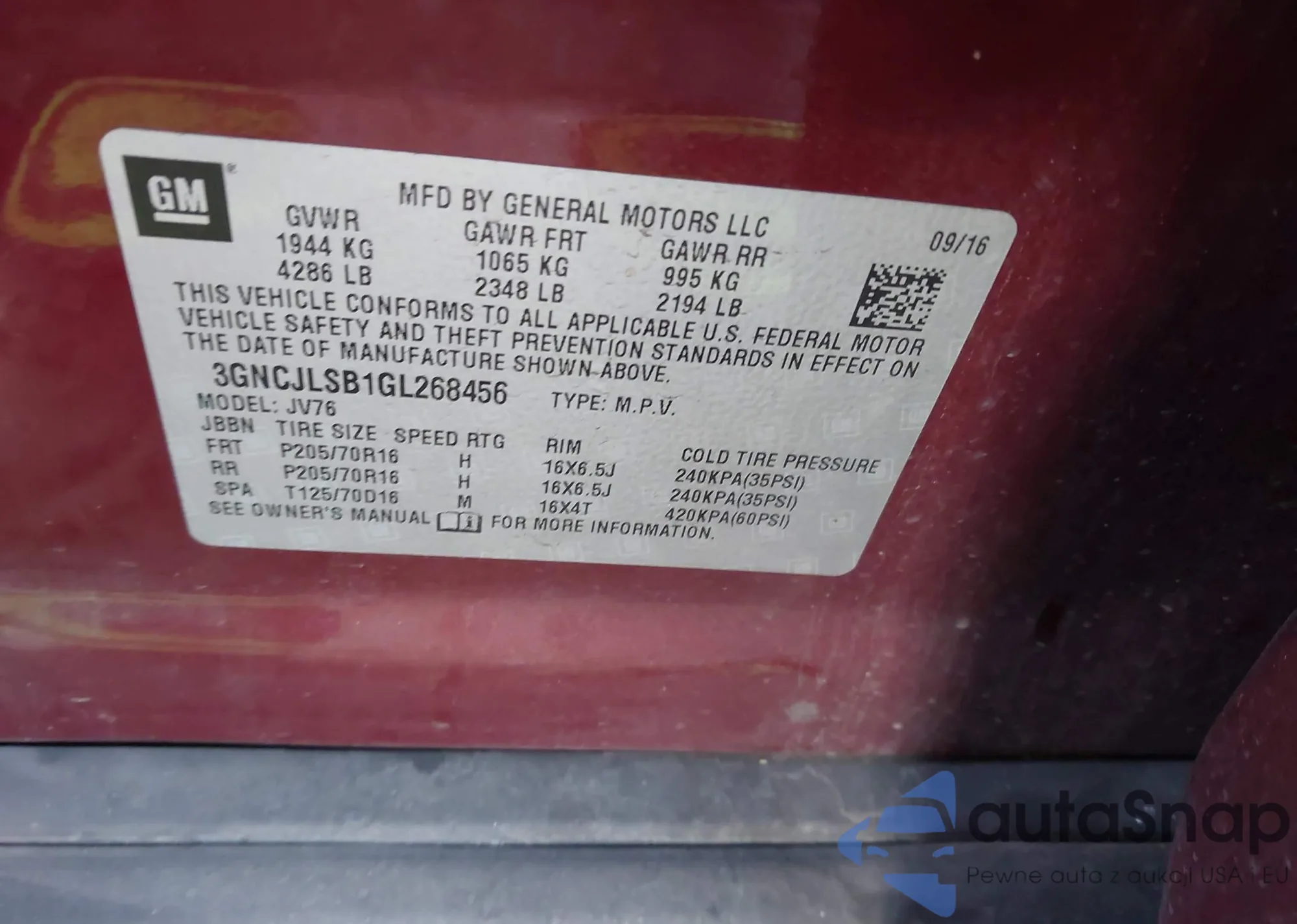 • VIN 3GNCJLSB1GL268456
