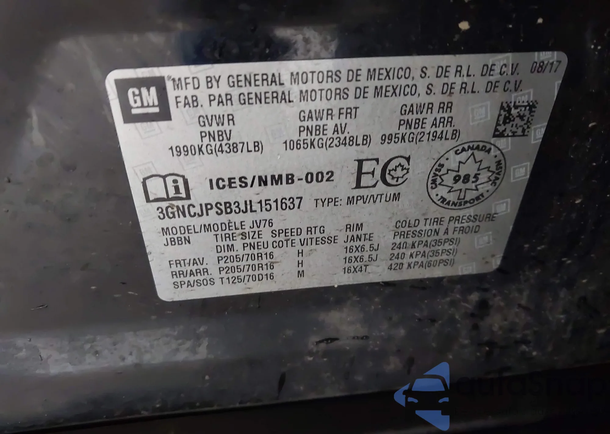 • VIN 3GNCJPSB3JL151637