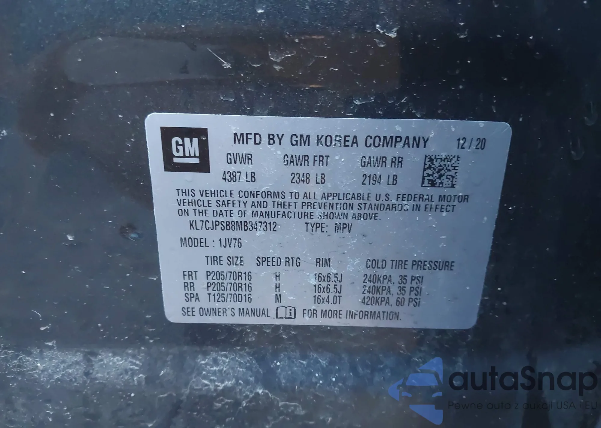 • VIN KL7CJPSB8MB347312