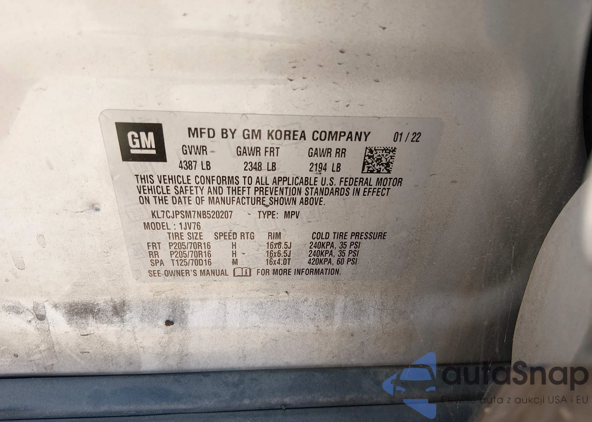 • VIN KL7CJPSM7NB520207