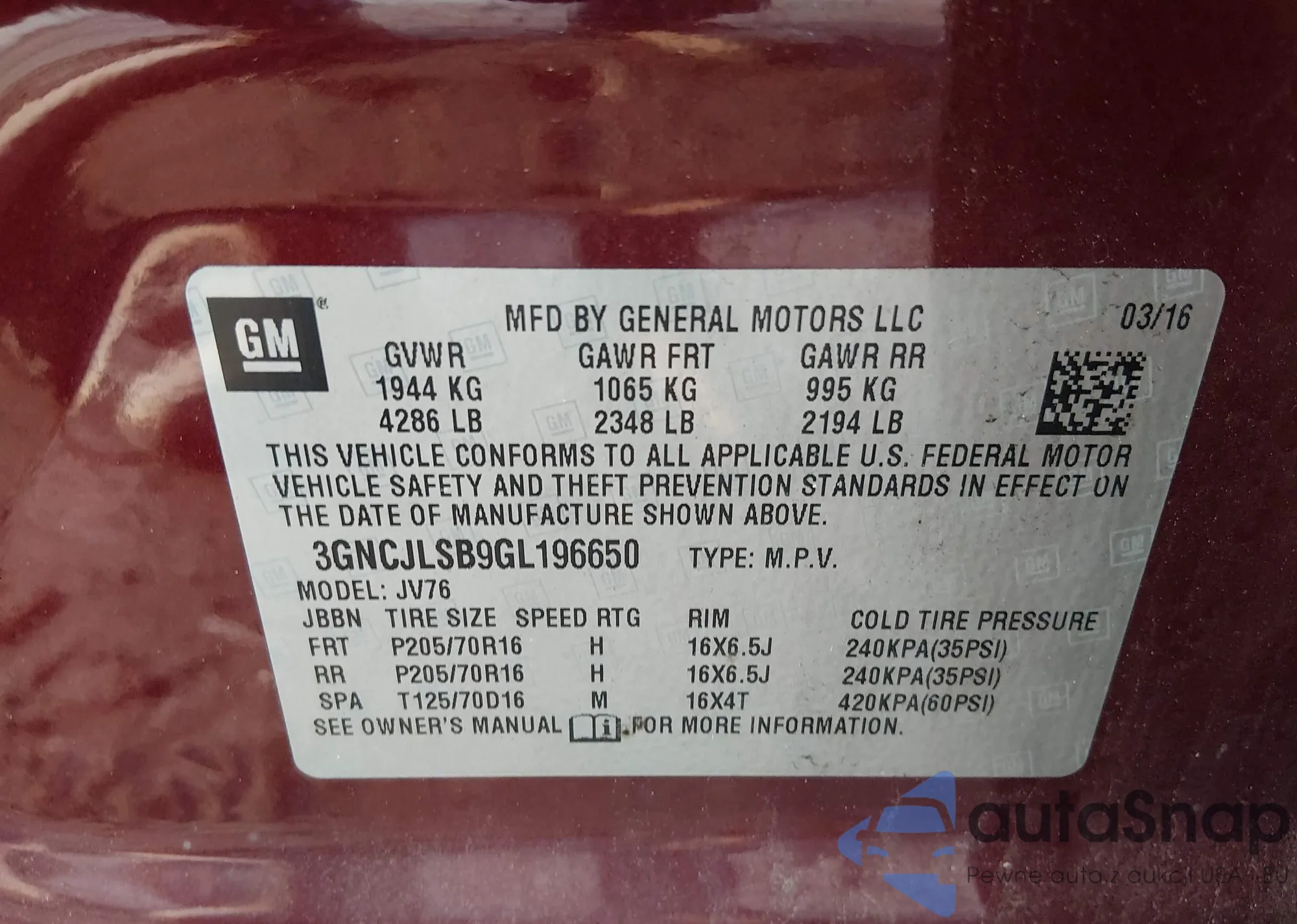 • VIN 3GNCJLSB9GL196650