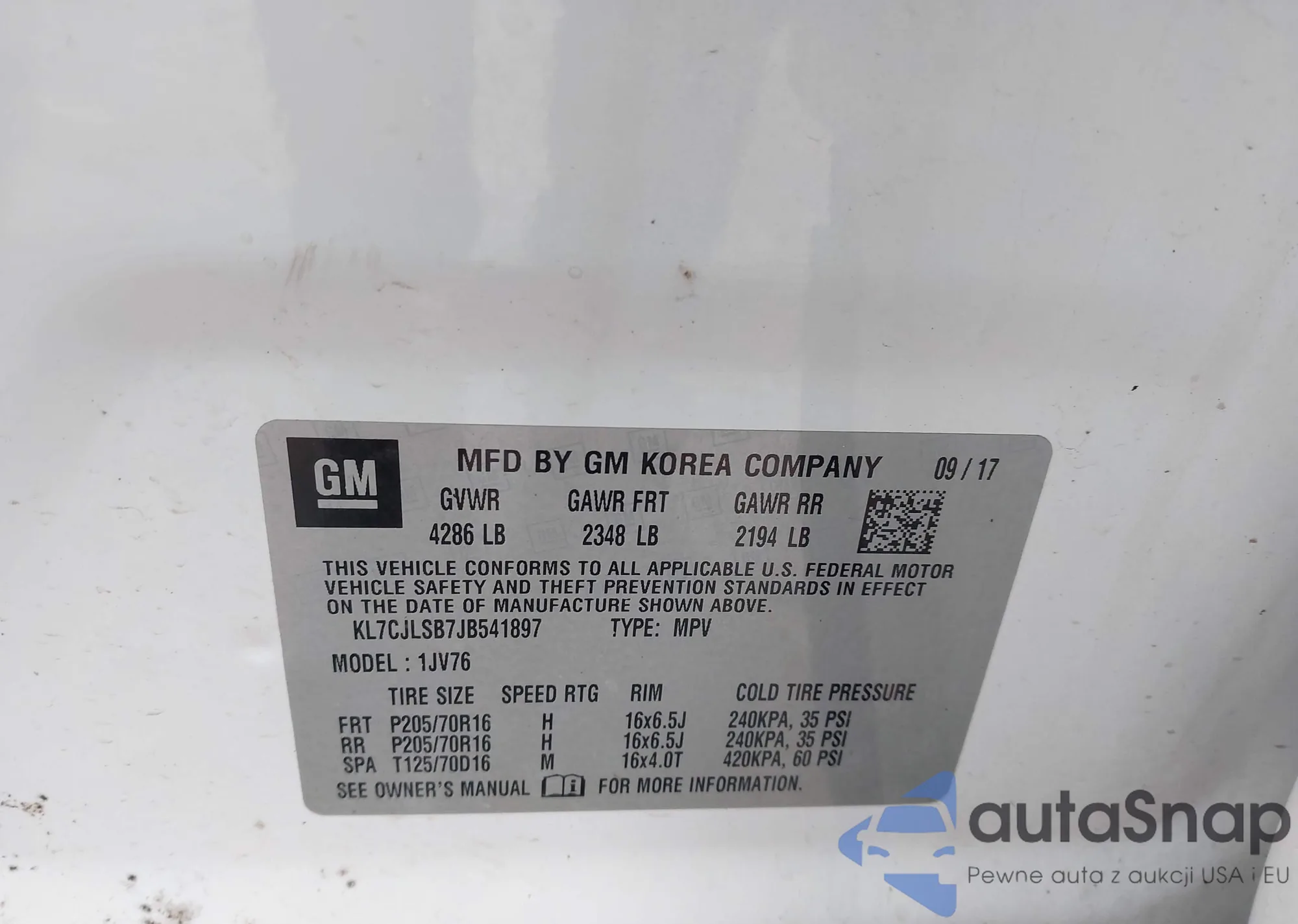 • VIN KL7CJLSB7JB541897