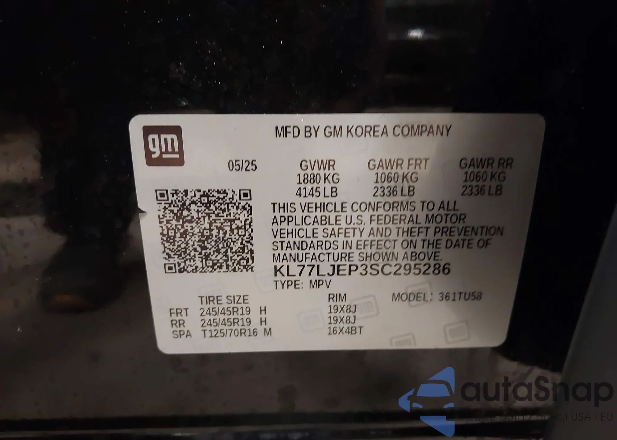 • VIN KL77LJEP3SC295286