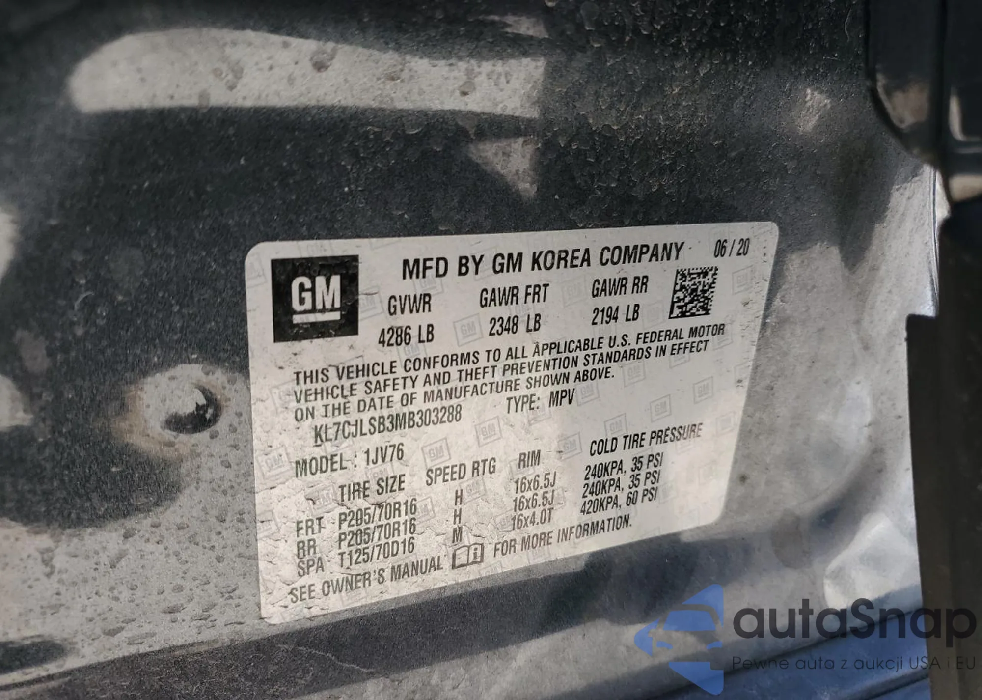 LOT: 90687645 VIN: KL7CJLSB3MB303288