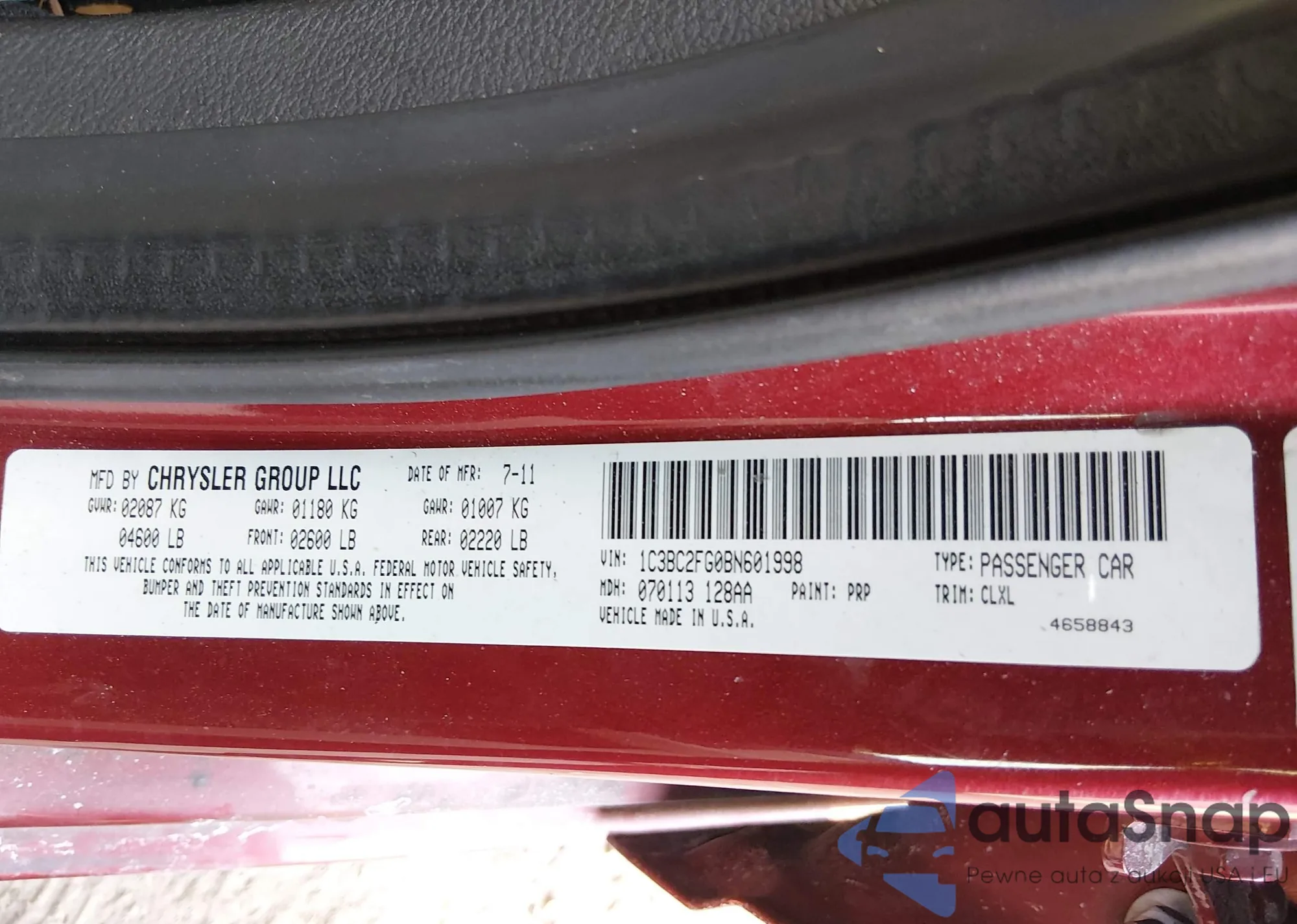 LOT: 44336405 VIN: 1C3BC2FG0BN601998