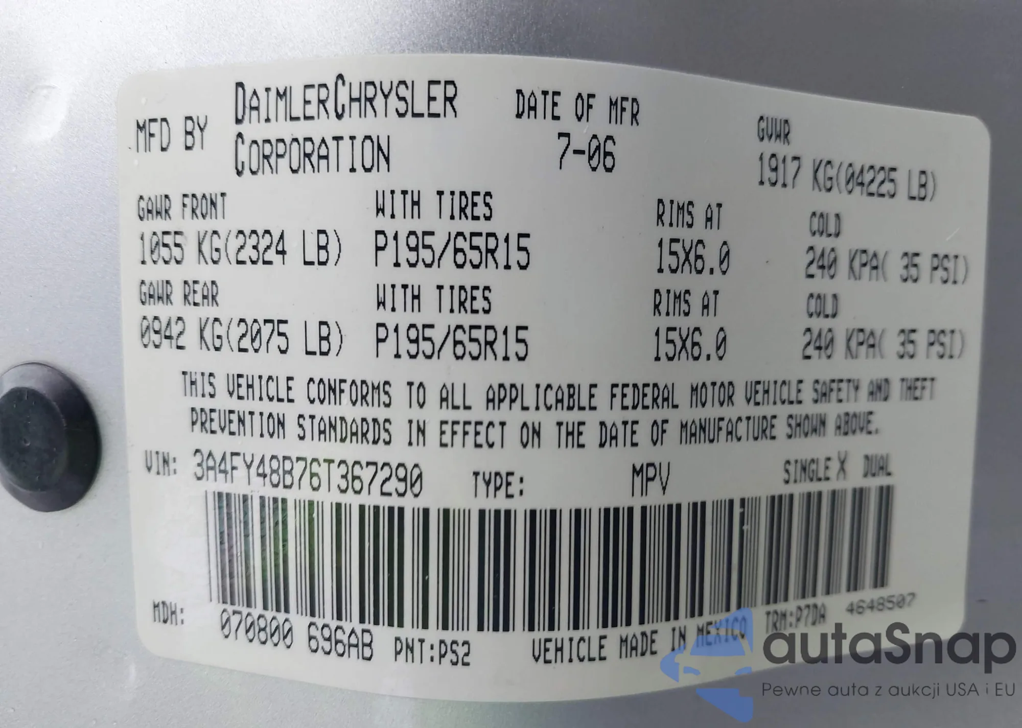 LOT: 44391345 VIN: 3A4FY48B76T367290