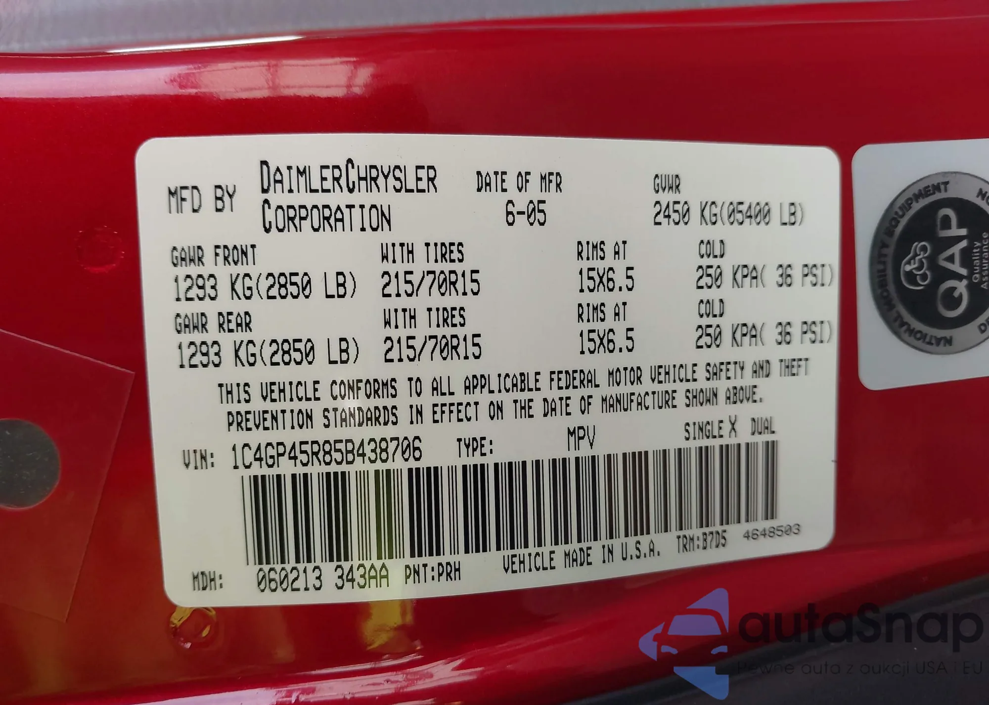 LOT: 72938565 VIN: 2C4GP44R95R545525