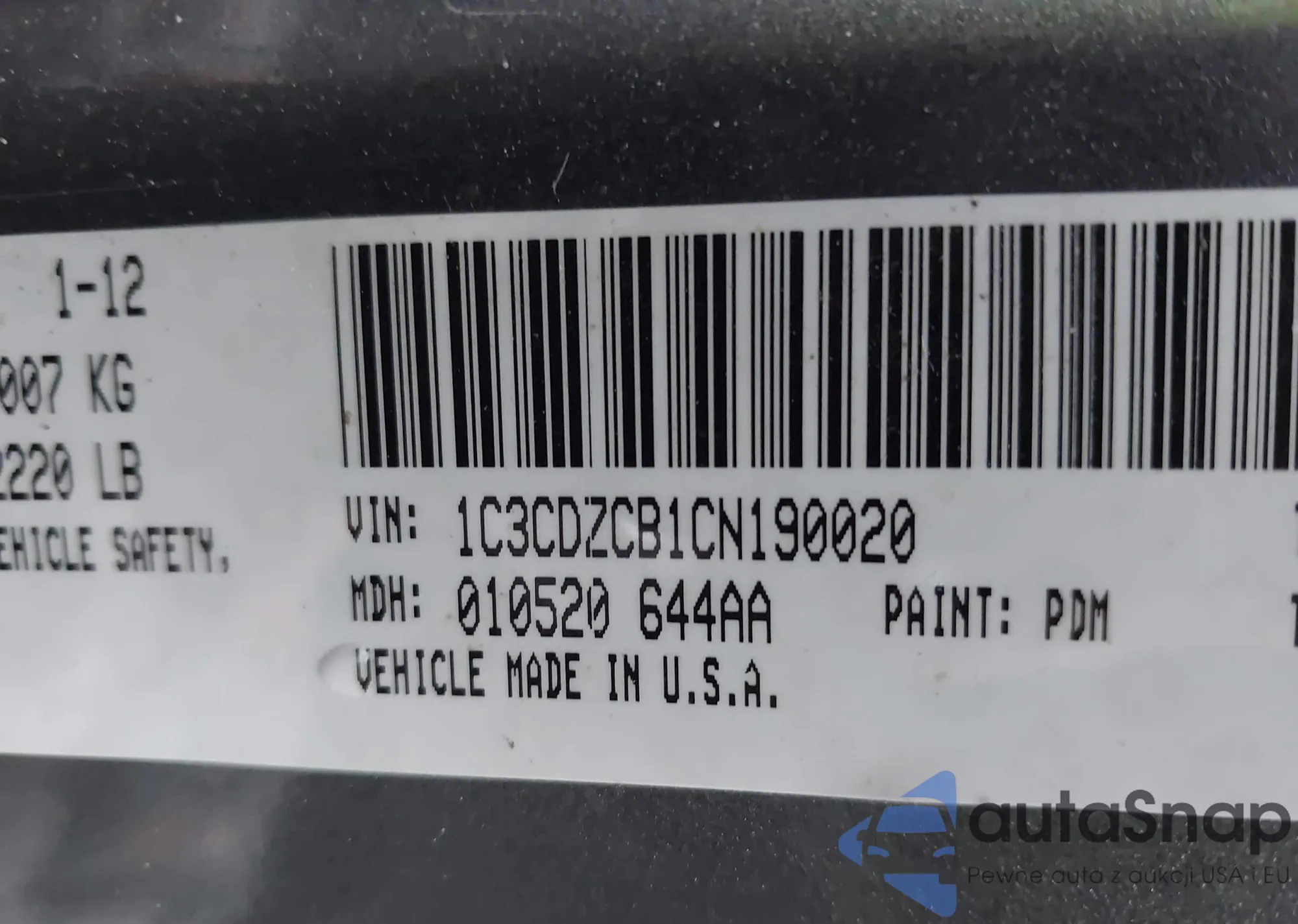 LOT: 44269764 VIN: 1C3CDZCB1CN190020