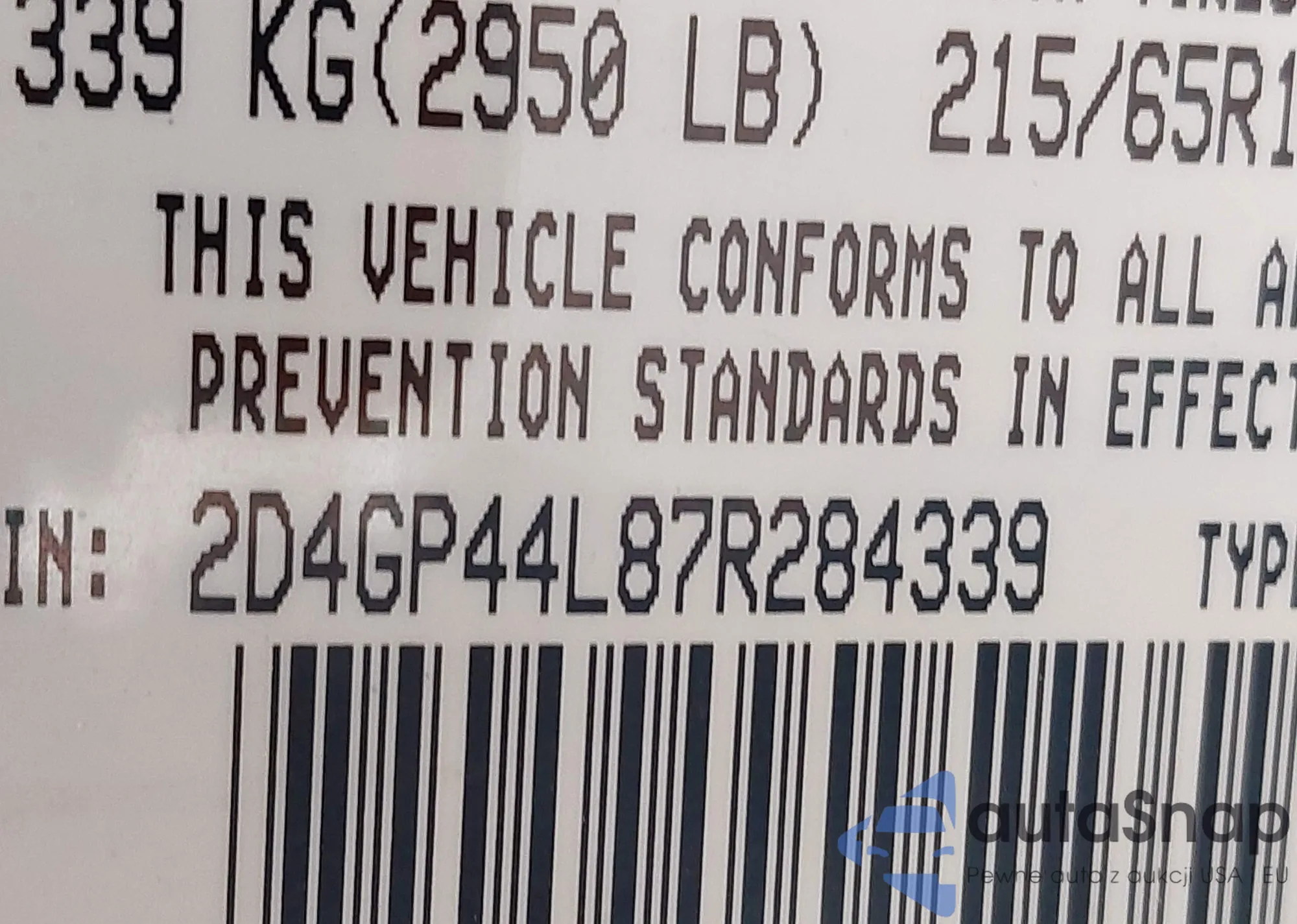 LOT: 44301947 VIN: 2D4GP44L87R284339