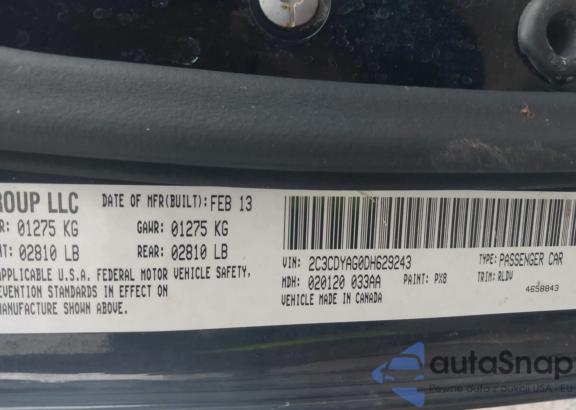 LOT: 44201745 VIN: 2C3CDYAG0DH629243