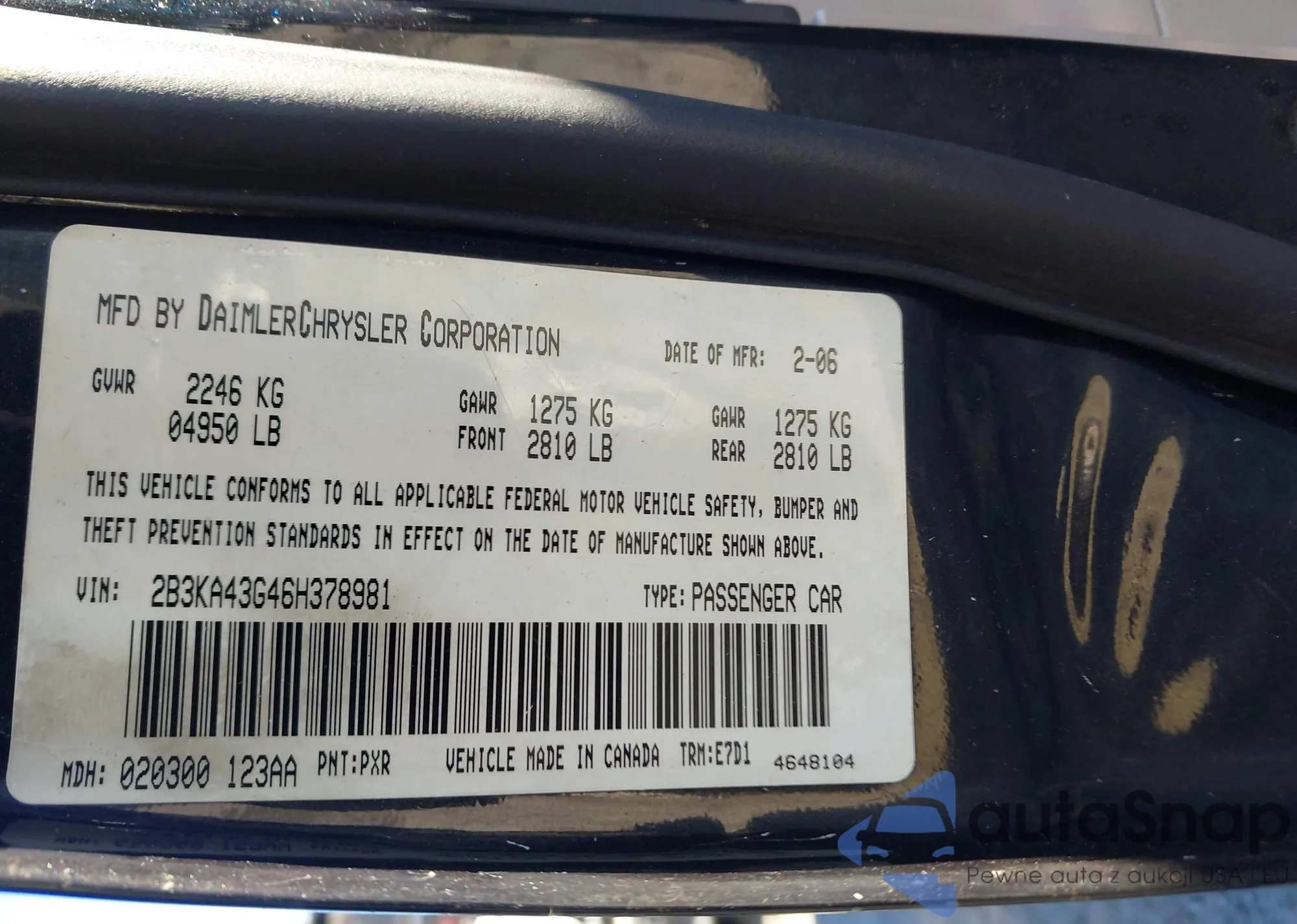 • VIN 2B3KA43G46H378981