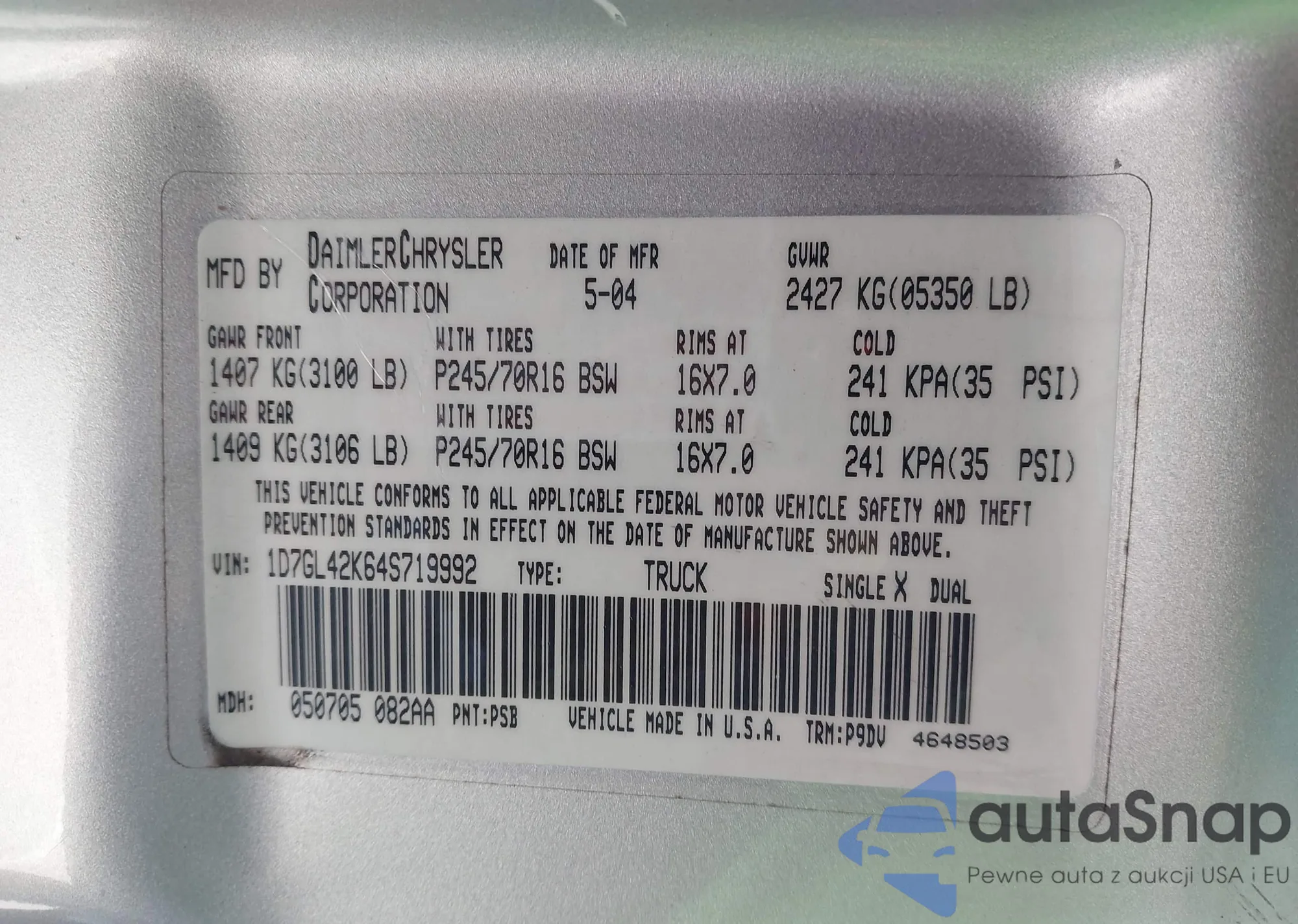 • VIN 1D7GL42K64S719992