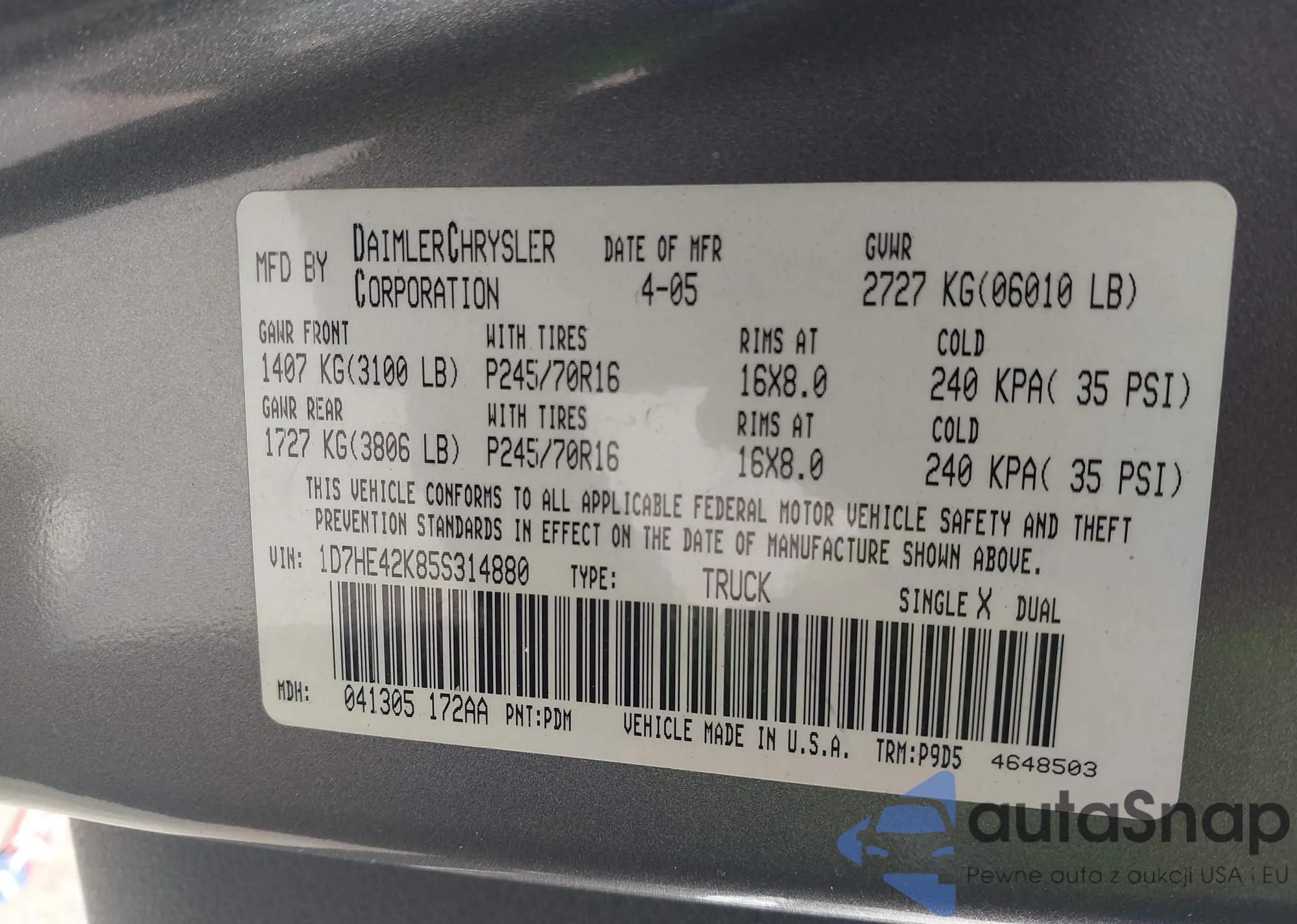 • VIN 1D7HE42K85S314880