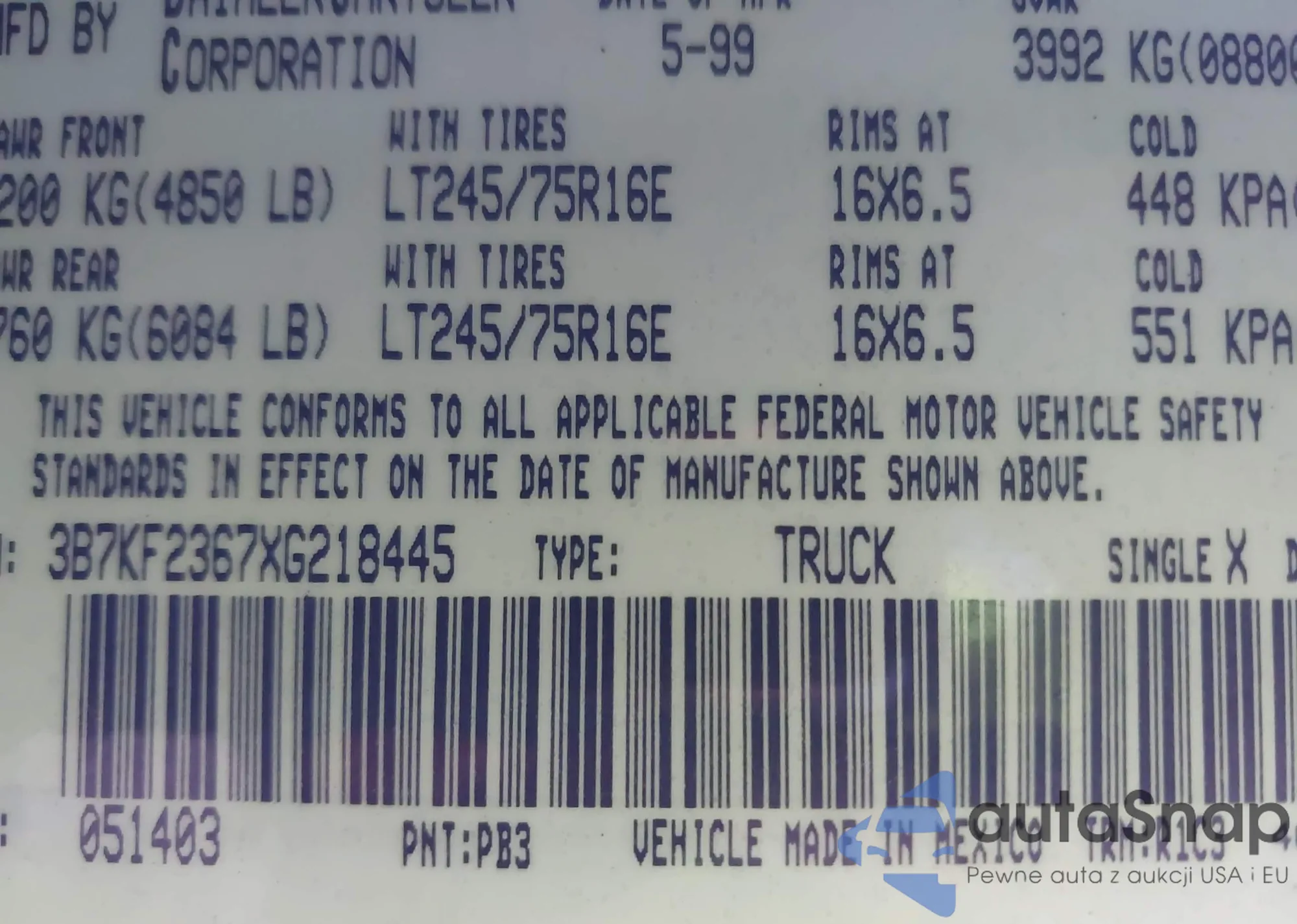 • VIN 3B7KF2367XG218445