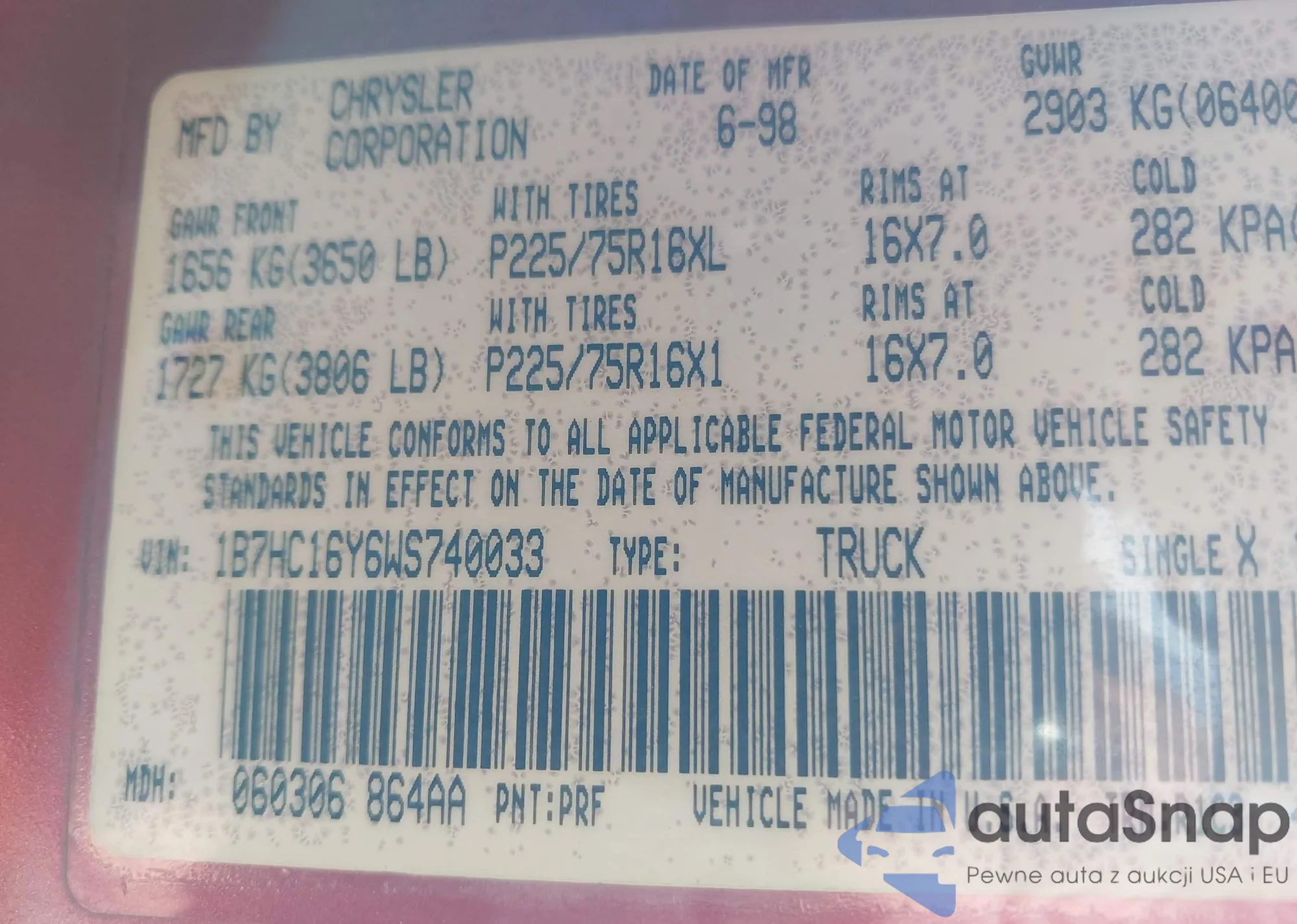 • VIN 1B7HC16Y6WS740033