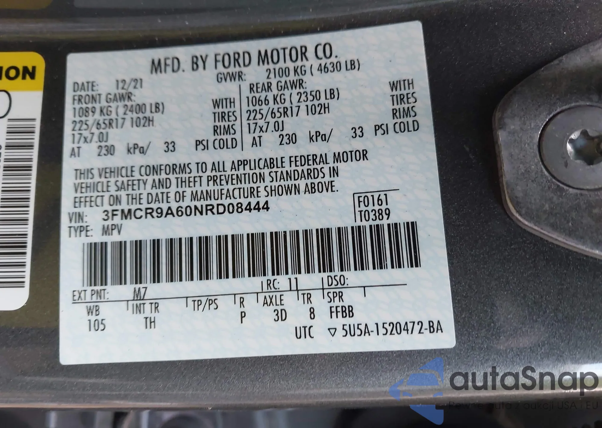 • VIN 3FMCR9A60NRD08444