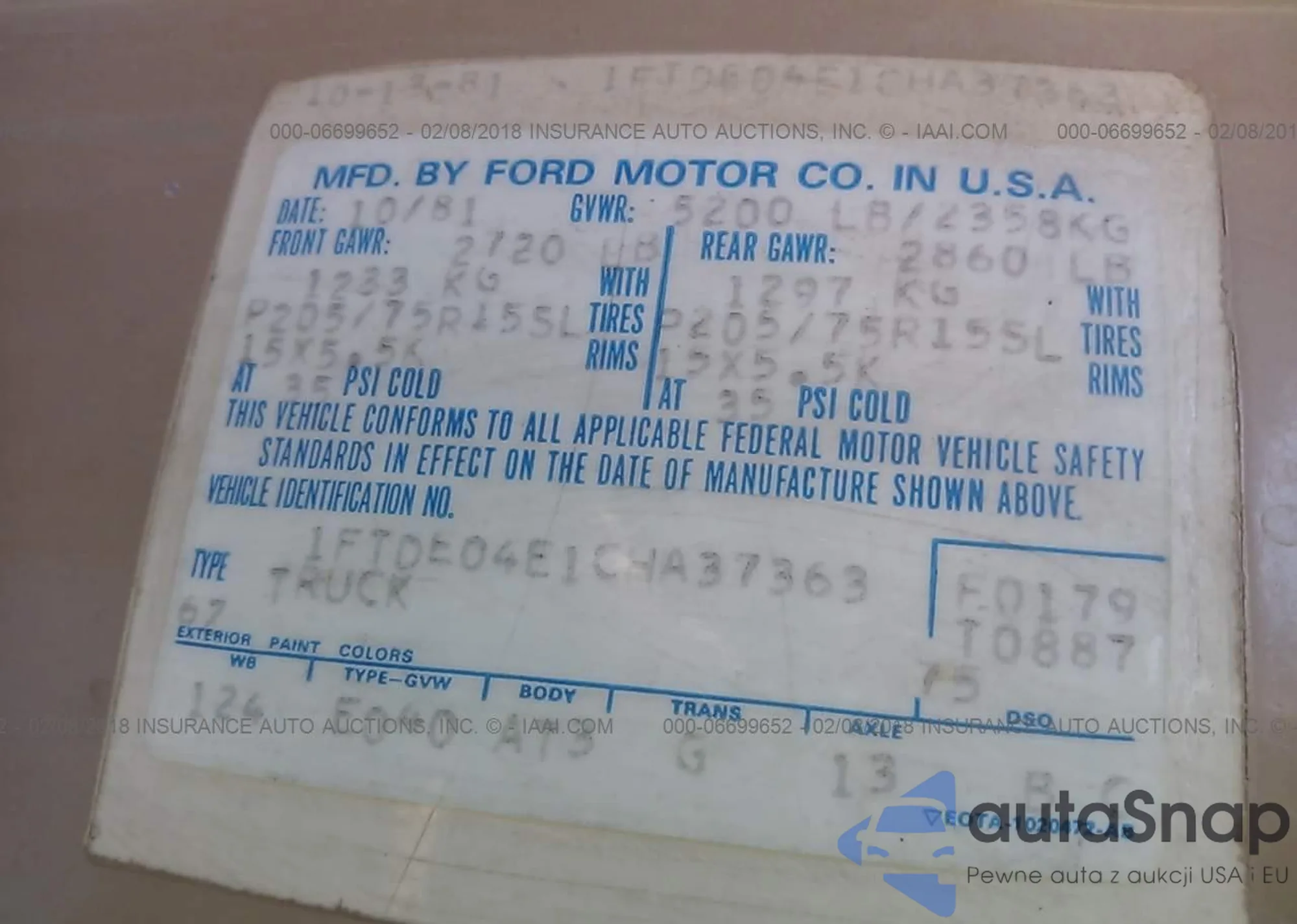 LOT: 6699652 VIN: 1FTDE04E1CHA37363