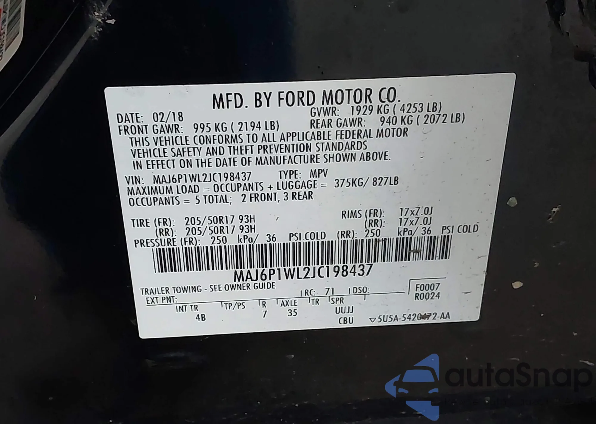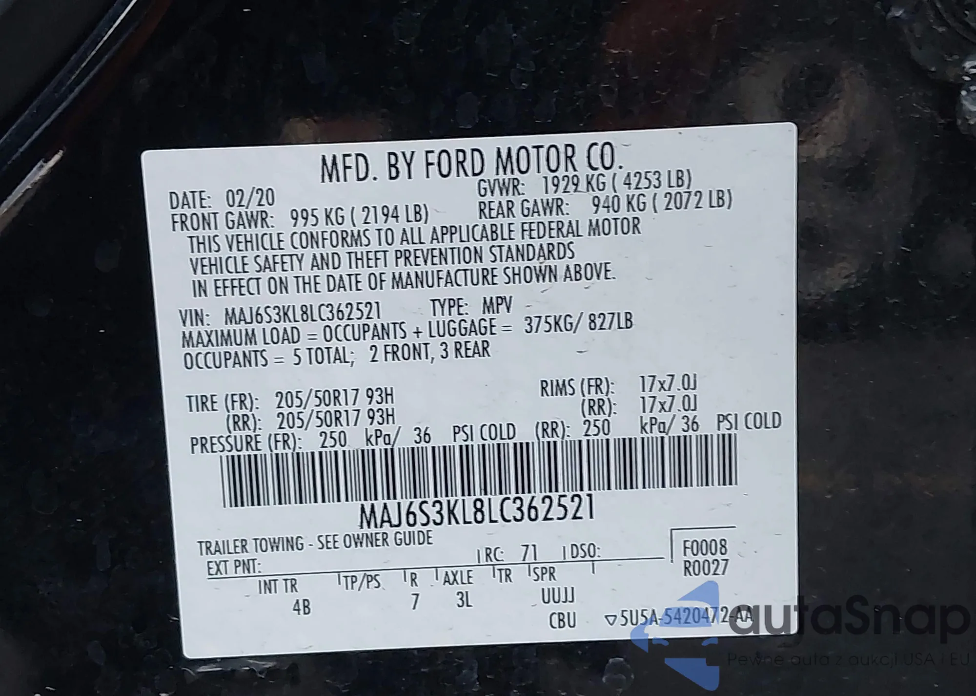 • VIN MAJ6S3KL8LC362521