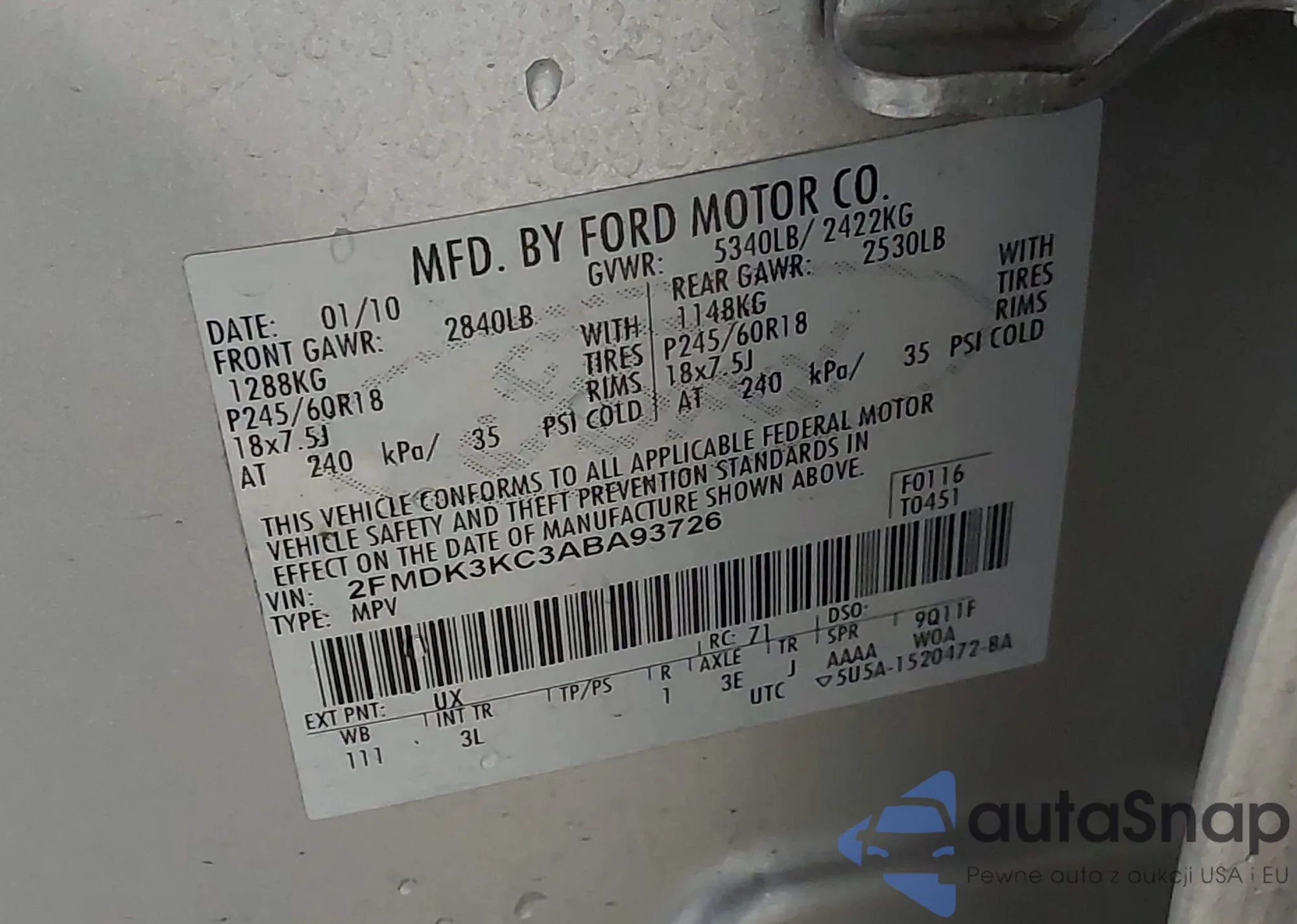 • VIN 2FMDK3KC3ABA93726
