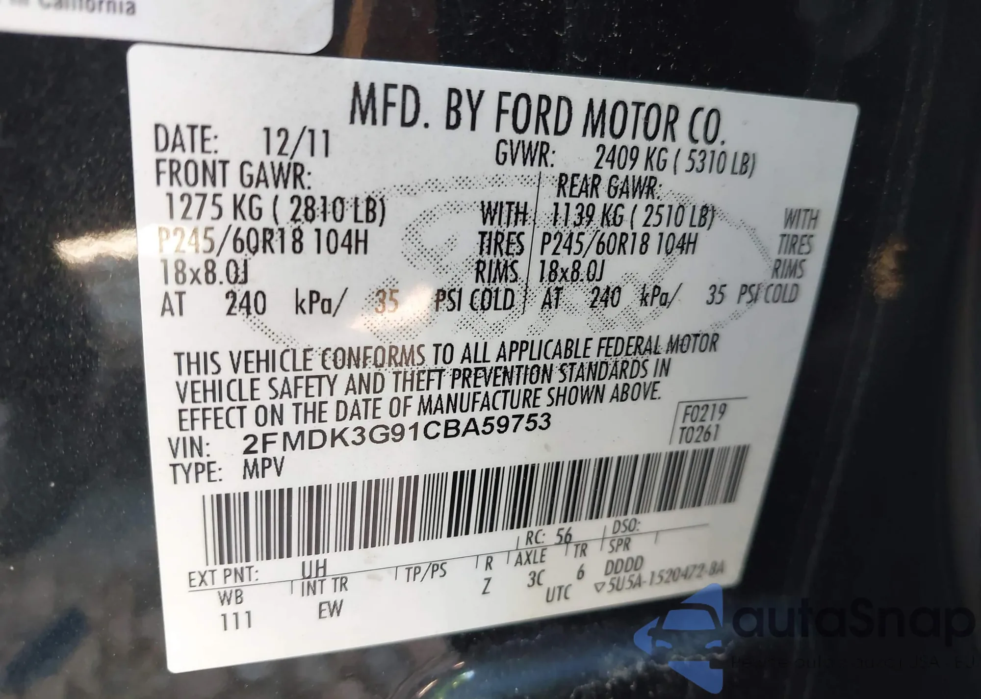 • VIN 2FMDK3G91CBA59753