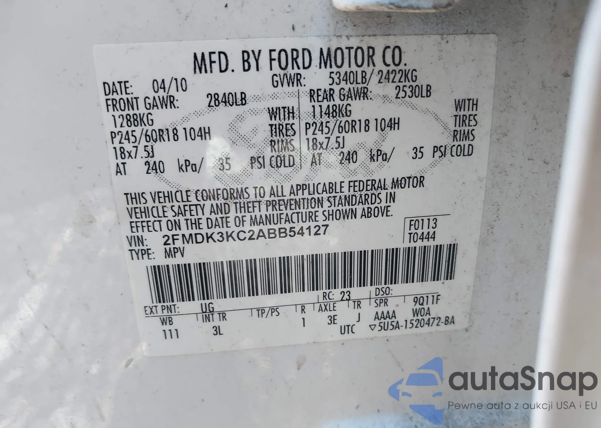 • VIN 2FMDK3KC2ABB54127