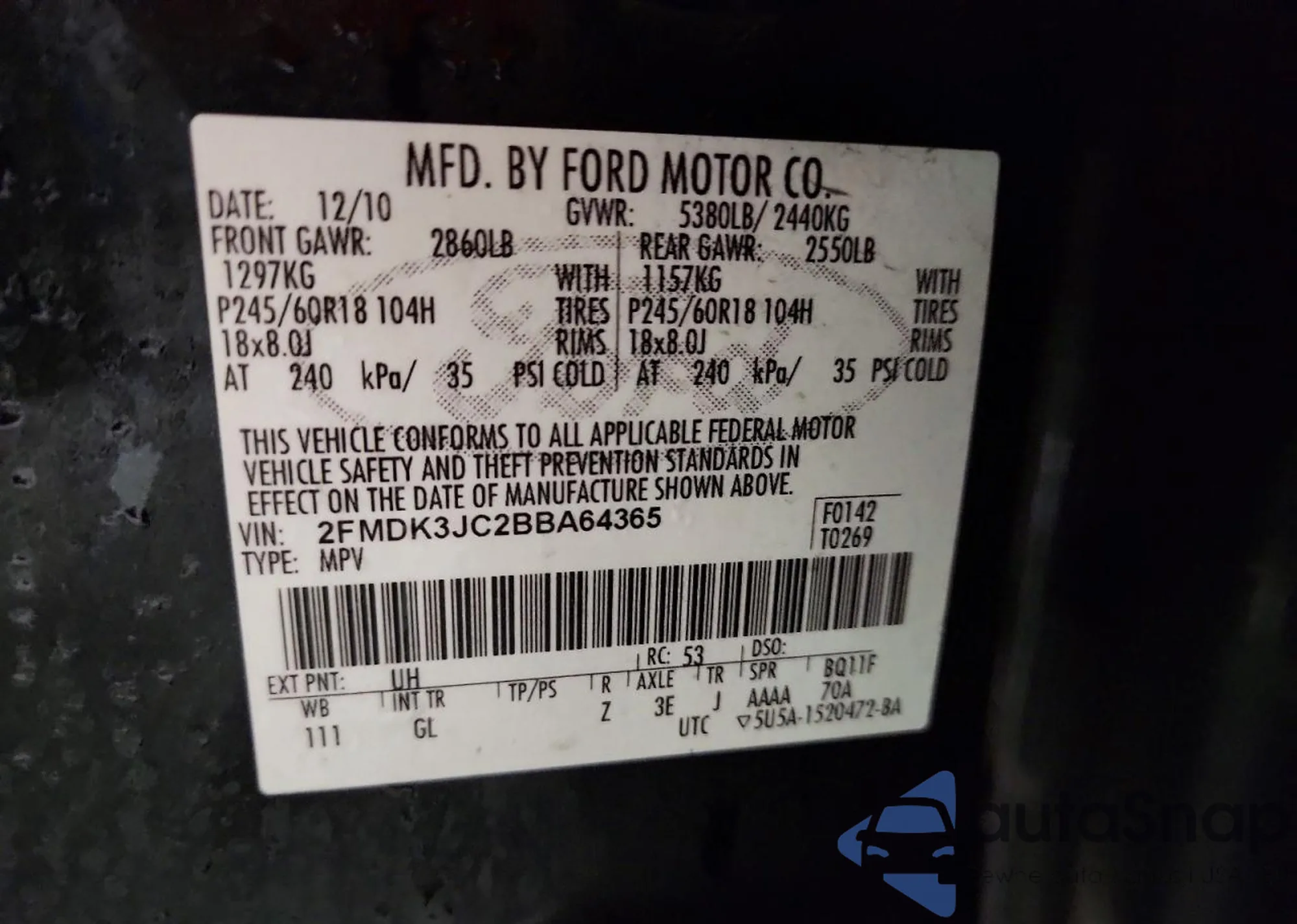 LOT: 44228145 VIN: 2FMDK3KC5BBA08743