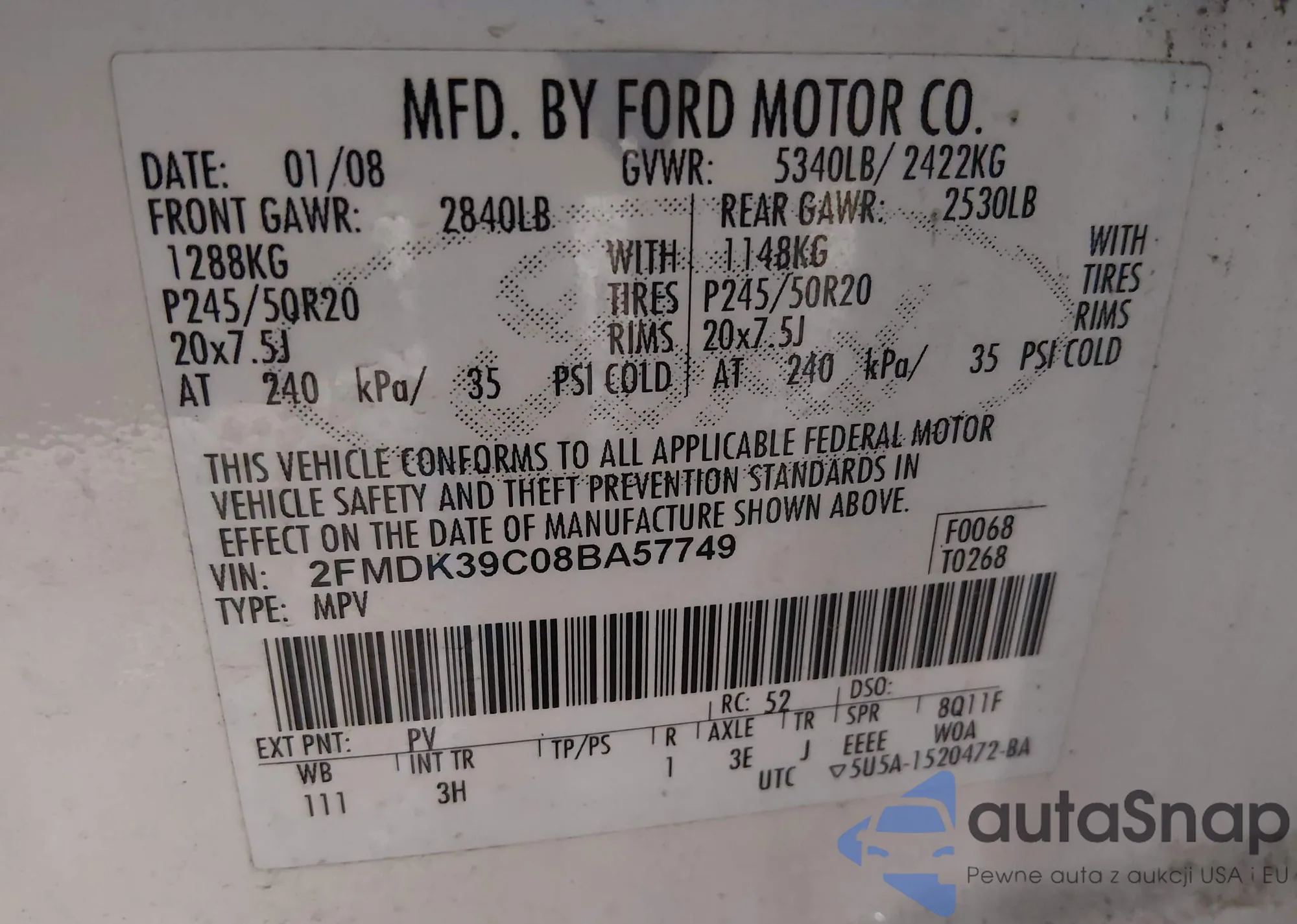 • VIN 2FMDK39C08BA57749
