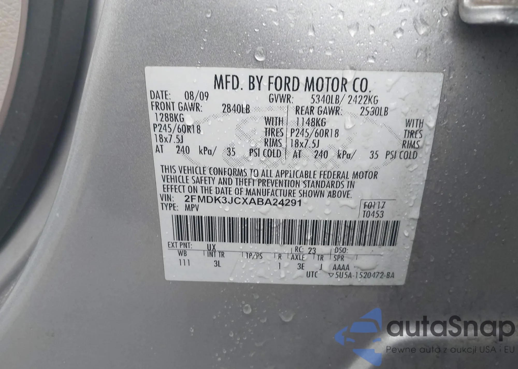 • VIN 2FMDK3JCXABA24291